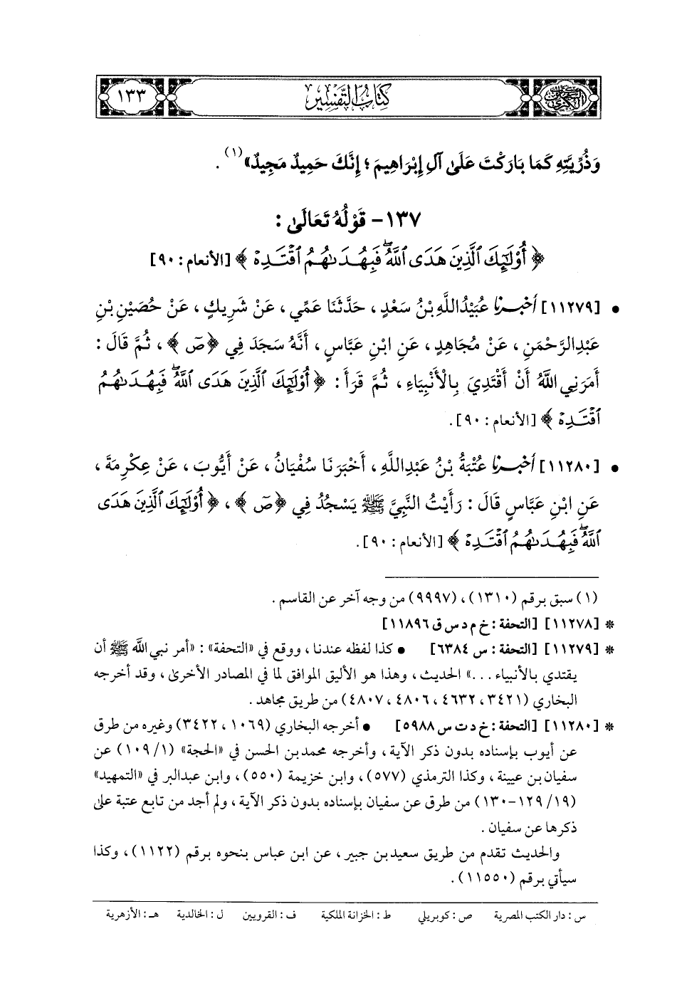 11280- أَخبَرنا عُتْبَةُ بنُ عَبدِ اللهِ، أَخبَرنا سُفيانُ، عَن أَيوبَ، عَن عِكْرِمَةَ، عَنِ ابنِ عَبَّاسٍ، قَالَ: رَأَيْتُ النَّبيَّ صَلى الله عَليه وسَلم يَسْجُدُ فِي {ص}؛ {أُولَئِكَ الَّذِينَ هَدَى اللهُ فَبِهُدَاهُمُ اقْتَدِهْ}.
