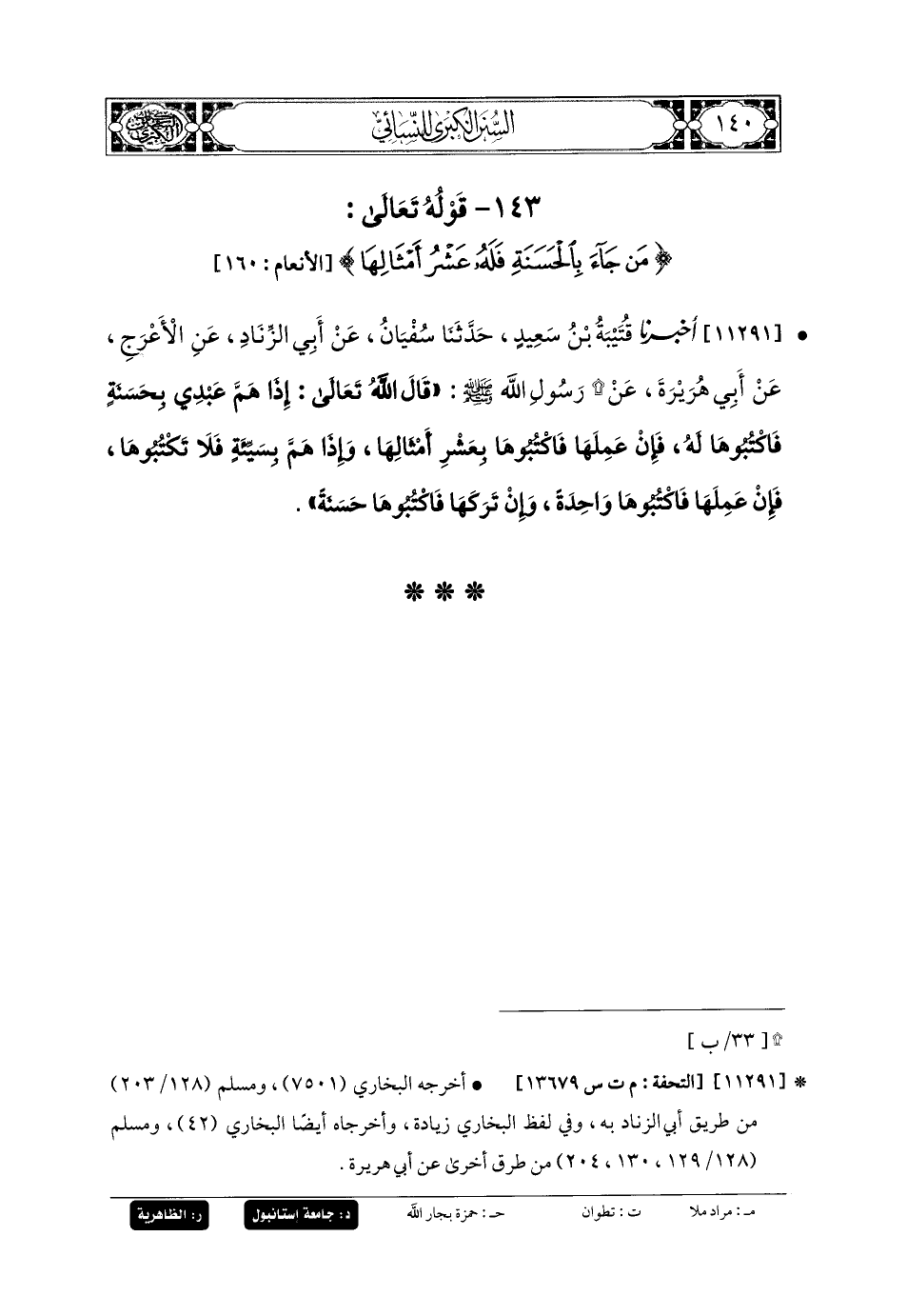 11291- أَخبَرنا قُتَيبَةُ بنُ سَعِيدٍ، حَدثنا سُفيانُ، عَن أَبي الزِّنَادِ، عَنِ الأَعْرَجِ، عَن أَبي هُرَيرَةَ، عَن رَسُولِ اللهِ صَلى الله عَليه وسَلم: قَالَ اللهُ تَعَالَى: إِذَا هَمَّ عَبدِي بِحَسَنَةٍ فَاكْتُبُوهَا لَهُ، فَإِنْ عَمِلَهَا، فَاكْتُبُوهَا بِعَشْرِ أَمْثَالِهَا، وَإِذَا هَمَّ بِسَيِّئَةٍ فَلا تَكْتُبُوهَا، فَإِنْ عَمِلَهَا، فَاكْتُبُوهَا وَاحِدَةً، وَإِنْ تَرَكَهَا، فَاكْتُبُوهَا حَسَنَةً.