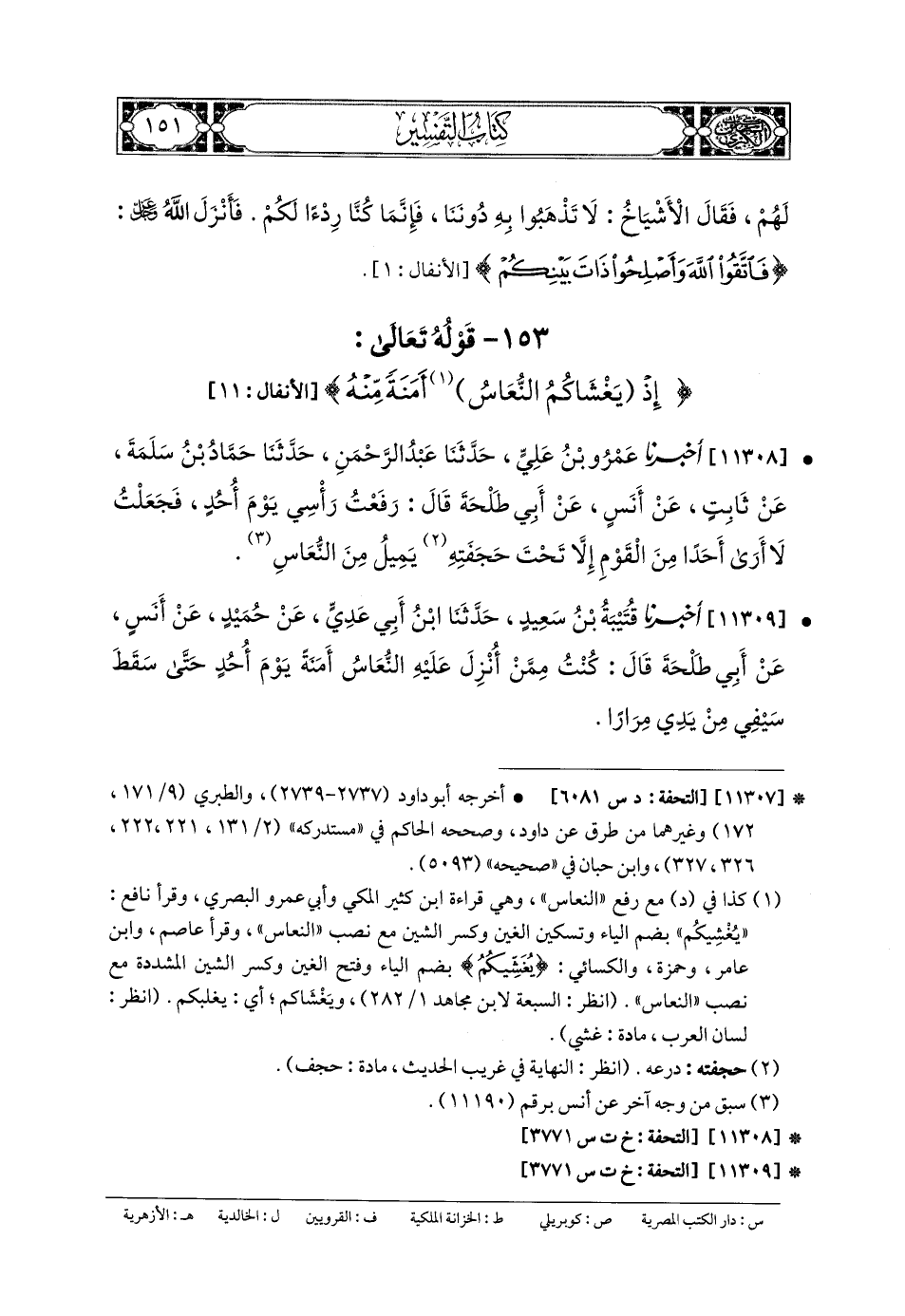 11308- أَخبَرنا عَمرُو بنُ عَليٍّ، حَدثنا عَبدُ الرَّحمَنِ، حَدثنا حَمَّادُ بنُ سَلَمَةَ، عَن ثَابِتٍ، عَن أَنَسٍ، عَن أَبي طَلحَةَ، قَالَ: رَفَعْتُ رَأْسِي يَوْمَ أُحُدٍ، فَجَعَلْتُ لا أَرَى أَحَدًا مِنَ القَوْمِ إِلاَّ تَحْتَ حَجَفَتِهِ يَمِيلُ مِنَ النُّعَاسِ.