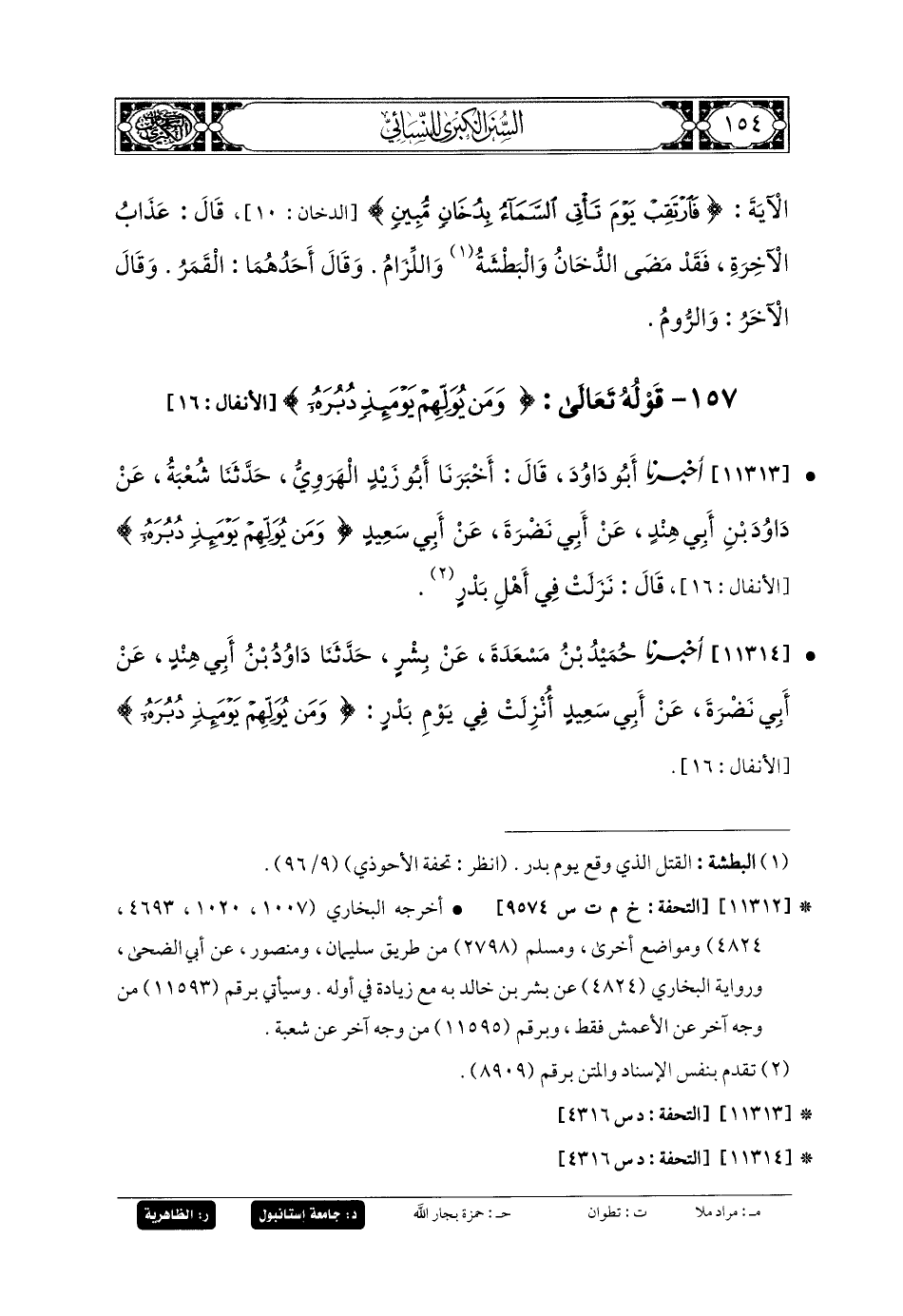 11314- أَخبَرنا حُمَيْدُ بنُ مَسْعَدَةَ، عَن بِشْرٍ، حَدثنا دَاوُدُ بنُ أَبي هِنْدٍ، عَن أَبي نَضْرَةَ، عَن أَبي سَعِيدٍ: أُنْزِلَتْ فِي يَوْمِ بَدْرٍ {وَمَنْ يُوَلِّهِمْ يَوْمَئِذٍ دُبُرَهُ}.