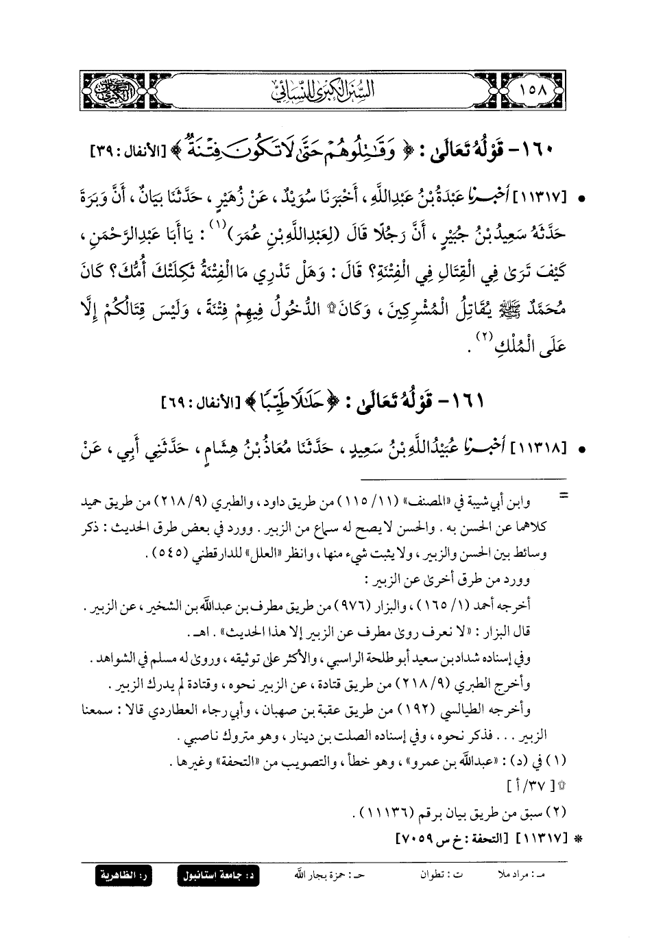 11317- أَخبَرنا عَبدَةُ بنُ عَبدِ اللهِ، أَخبَرنا سُوَيْدٌ، عَن زُهَيْرٍ، حَدثنا بَيَانٌ، أَنَّ وَبَرَةَ حَدَّثَهُ سَعِيدُ بنُ جُبَيرٍ، أَنَّ رَجُلاً قَالَ لِعَبدِ اللهِ بنِ عُمَرَ: يَا أَبَا عَبدِ الرَّحمَنِ، كَيْفَ تَرَى فِي القِتَالِ فِي الفِتْنَةِ؟ قَالَ: وَهَلْ تَدْرِي مَا الفِتْنَةُ؟ ثَكِلَتْكَ أُمُّكَ، كَانَ مُحَمدٌ صَلى الله عَليه وسَلم يُقَاتِلُ المُشْرِكِينَ، وَكَانَ الدُّخُولُ فِيهِمْ فِتْنَةً، وَلَيْسَ قِتَالُكُمْ إِلاَّ عَلَى المُلْكِ.