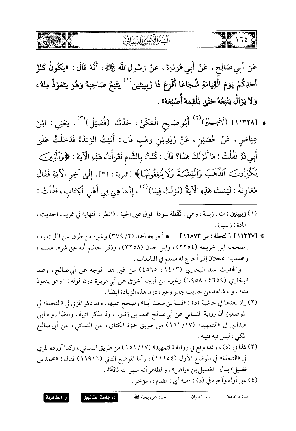 11328 - أَخبَرنا أَبو صَالِحٍ المَكِّيُّ، حَدثنا فُضَيْلُ، يَعْنِي ابنَ عِيَاضٍ، عَن حُصَيْنٍ، عَن زَيْدِ بنِ وَهْبٍ، قَالَ: أَتَيْتُ الرَّبَذَةَ فَدَخَلْتُ عَلَى أَبي ذَرٍّ، فَقُلْتُ: مَا أَنْزَلَكَ هَذَا؟ قَالَ: كُنْتُ بِالشَّامِ فَقَرَأْتُ هَذِهِ الآيَةَ: {وَالَّذِينَ يَكْنِزُونَ الذَّهَبَ وَالفِضَّةَ وَلا يُنْفِقُونَهَا} إِلَى آخِرِ الآيَةِ، فَقَالَ مُعاويَةُ: لَيْسَتْ هَذِهِ الآيَةُ نَزَلَتْ فِينَا، إِنَّمَا هِيَ فِي أَهْلِ الكِتَابِ، فَقُلْتُ: إِنَّهَا فِينَا وَفِي أَهْلِ الكِتَابِ، إِلَى أَنْ كَانَ قَوْلٌ وَتَنَازُعٌ، وَكَتَبَ إِلَى عُثْمَانَ يَشْكُونِي، كَتَبَ إِلَيَّ عُثْمَانُ رَحِمَهُ اللهُ؛ أَنِ اقْدَمْ، فَقَدِمْتُ المَدِينَةَ، فَكَثُرَ وَرَائِي النَّاسُ كَأَنَّهُمْ لَمْ يَرَوْنِي قَطُّ، فَدَخَلْتُ عَلَى عُثْمَانَ، فَشَكَوْتُ إِلَيْهِ ذَلِكَ، فَقَالَ: تَنَحَّ، وَكُنْ قَرِيبًا، فَنَزَلْتُ هَذَا المَنْزِلَ، وَاللهِ لَوْ أُمِّرَ عَلَيَّ حَبَشِيٌّ مَا عَصَيْتُهُ وَلا أَرْجِعُ عَن قَوْلِي.