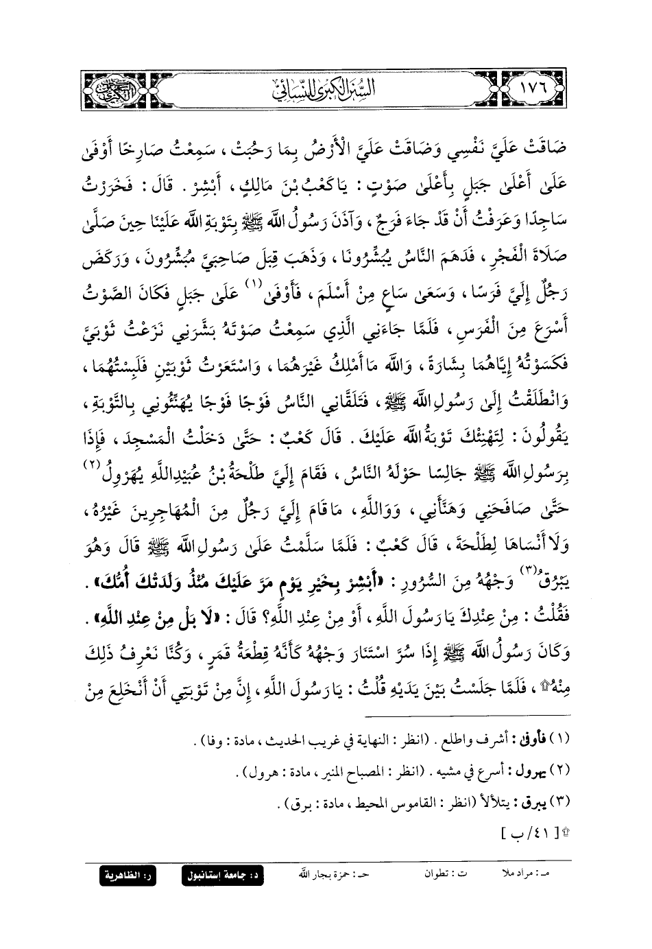 قَالَ كَعْبٌ: فَلَمَّا سَلَّمْتُ عَلَى رَسُولِ اللهِ صَلى الله عَليه وسَلم قَالَ: وَهُوَ يَبْرُقُ وَجْهُهُ مِنَ السُّرُورِ: أَبْشِرْ بِخَيْرِ يَوْمٍ مَرَّ عَلَيْكَ مُنْذُ وَلَدَتْكَ أُمُّكَ، فَقُلْتُ: مِنْ عِنْدِكَ يَا رَسُولَ اللهِ، أَوْ مِنْ عِنْدِ اللهِ؟ قَالَ: لا، بَلْ مِنْ عِنْدِ اللهِ، وَكَانَ رَسُولُ اللهِ صَلى الله عَليه وسَلم إِذَا سُرَّ اسْتَنَارَ وَجْهُهُ كَأَنَّهُ قِطْعَةُ قَمَرٍ، وَكُنَّا نَعْرِفُ ذَلِكَ مِنْهُ، فَلَمَّا جَلَسْتُ بَيْنَ يَدَيْهِ، قُلْتُ: يَا رَسُولَ اللهِ، إِنَّ مِنْ تَوْبَتِي أَنْ أَنْخَلِعَ مِنْ مَالِي صَدَقَةً إِلَى اللهِ تَبَارَكَ وَتَعَالَى، وَإِلَى رَسُولِ اللهِ صَلى الله عَليه وسَلم، قَالَ رَسُولُ اللهِ صَلى الله عَليه وسَلم: أَمْسِكْ عَلَيْكَ بَعْضَ مَالِكَ، فَهُوَ خَيْرٌ لَكَ، قُلْتُ: فَإِنِّي أُمْسِكُ سَهْمِي الَّذِي بِخَيْبَرَ، قُلْتُ: يَا رَسُولَ اللهِ، إِنَّ اللهَ تَعَالَى إِنَّمَا أَنْجَانِي بِالصِّدْقِ، وَإِنَّ مِنْ تَوْبَتِي أَلاَّ أُحَدِّثَ إِلاَّ صِدْقًا مَا بَقِيتُ، فَوَاللَّهِ مَا أَحَدٌ مِنَ المُسْلِمِينَ أَبْلاهُ اللهُ فِي صِدْقِ الحَدِيثِ مُنْذُ ذَكَرْتُ ذَلِكَ لِرَسُولِ اللهِ صَلى الله عَليه وسَلم أَحْسَنَ مِمَّا أَبْلانِي، وَمَا تَعْلَمُونَ مُنْذُ ذَكَرْتُ ذَلِكَ لِرَسُولِ اللهِ صَلى الله عَليه وسَلم كَذِبًا، وَإِنِّي لأَرْجُو أَنْ يَحْفَظَنِي اللهُ فِيمَا بَقِيَ، فَأَنْزَلَ اللهُ عَزَّ وَجَلَّ: {لَقَدْ تَابَ اللهُ عَلَى النَّبيِّ وَالمُهَاجِرِينَ وَالأَنْصَارِ الَّذِينَ اتَّبَعُوهُ فِي سَاعَةِ العُسْرَةِ} تَلا إِلَى: {الصَّادِقِينَ}، فَوَاللَّهِ مَا أَنْعَمَ اللهُ عَلَيَّ مِنْ نِعْمَةٍ قَطُّ بَعْدَ أَنْ هَدَانِي لِلإِسلامِ بِأَعْظَمَ فِي نَفْسِي مِنْ صِدْقِ رَسُولِ اللهِ صَلى الله عَليه وسَلم يَوْمَئِذٍ، أَلاَّ أَكُونَ كَذَبْتُهُ فَأَهْلِكَ كَمَا هَلَكَ الَّذِينَ كَذَبُوهُ، حَتَّى أَنْزَلَ الوَحْيُ بِشَرِّ مَا قَالَ لأَحَدٍ: {سَيَحْلِفُونَ بِاللهِ لَكُمْ إِذَا انْقَلَبْتُمْ إِلَيْهِمْ لِتُعْرِضُوا عَنهُمْ} إِلَى: {الفَاسِقِينَ}، قَالَ كَعْبٌ: وَكُنَّا تَخَلَّفْنَا أَيُّهَا الثَّلاثَةُ عَن أَمْرِ أُولَئِكَ الَّذِينَ قَبِلَ مِنْهُمْ رَسُولُ اللهِ صَلى الله عَليه وسَلم حِينَ حَلَفُوا لَهُ، فَبَايَعَهُمْ وَاسْتَغْفَرَ لَهُمْ، وَأَرْجَأَ رَسُولُ اللهِ صَلى الله عَليه وسَلم أَمْرَنَا حَتَّى قَضَى اللهُ فِيهِ، فَلِذَلِكَ قَالَ اللهُ عَزَّ وَجَلَّ: {وَعَلَى الثَّلاثَةِ الَّذِينَ خُلِّفُوا} وَلَيْسَ الَّذِي ذَكَرَ اللهُ تَخَلُّفَنَا عَنِ الغَزْوِ، وَإِنَّمَا هُوَ تَخْلِيفُهُ إِيَّانَا، وَإِرْجَاؤُهُ أَمْرَنَا عَمَّنْ حَلَفَ لَهُ وَاعْتَذَرَ إِلَيْهِ فَقَبِلَ مِنْهُ. مُخْتَصَرٌ.