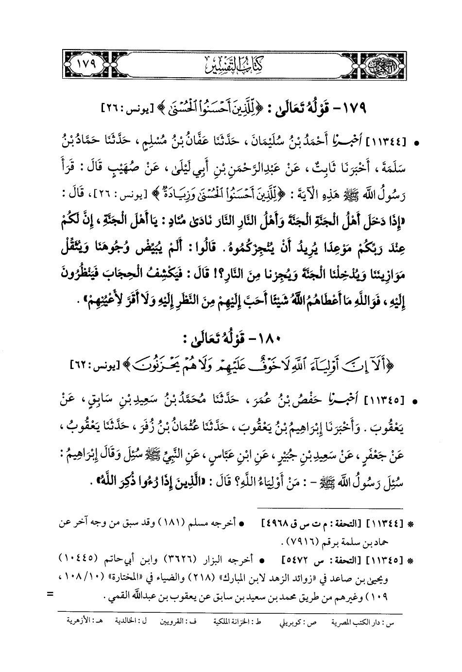 11344- أَخبَرنا أَحْمَدُ بنُ سُلَيمَانَ، حَدثنا عَفَّانُ بنُ مُسْلِمٍ، حَدثنا حَمَّادُ بنُ سَلَمَةَ، أَخبَرنا ثَابِتٌ، عَن عَبدِ الرَّحمَنِ بنِ أَبي لَيْلَى، عَن صُهَيْبٍ، قَالَ: قَرَأَ رَسُولُ اللهِ صَلى الله عَليه وسَلم هَذِهِ الآيَةَ: {لِلَّذِينَ أَحْسَنُوا الحُسْنَى وَزِيَادَةٌ} قَالَ: إِذَا دَخَلَ أَهْلُ الجَنَّةِ الجَنَّةَ، وَأَهْلُ النَّارِ النَّارَ، نَادَى مُنَادٍ: يَا أَهْلَ الجَنَّةِ، إِنَّ لَكُمْ عِنْدَ رَبِّكَمْ مَوْعِدًا يُرِيدُ أَنْ يُنْجِزَكُمُوهُ، قَالُوا: أَلَمْ يُبَيِّضْ وُجُوهَنَا، وَيُثَقِّلْ مَوَازِينَنَا، وَيُدْخِلْنَا الجَنَّةَ، وَيُجِرْنَا مِنَ النَّارِ؟ قَالَ: فَيَكْشِفُ الحِجَابَ فَيَنْظُرُونَ إِلَيْهِ، فَوَاللَّهِ مَا أَعْطَاهُمُ اللهُ شَيْئًا أَحَبَّ إِلَيْهِمْ مِنَ النَّظَرِ إِلَيْهِ، وَلا أَقَرَّ لأَعْيُنِهِمْ.