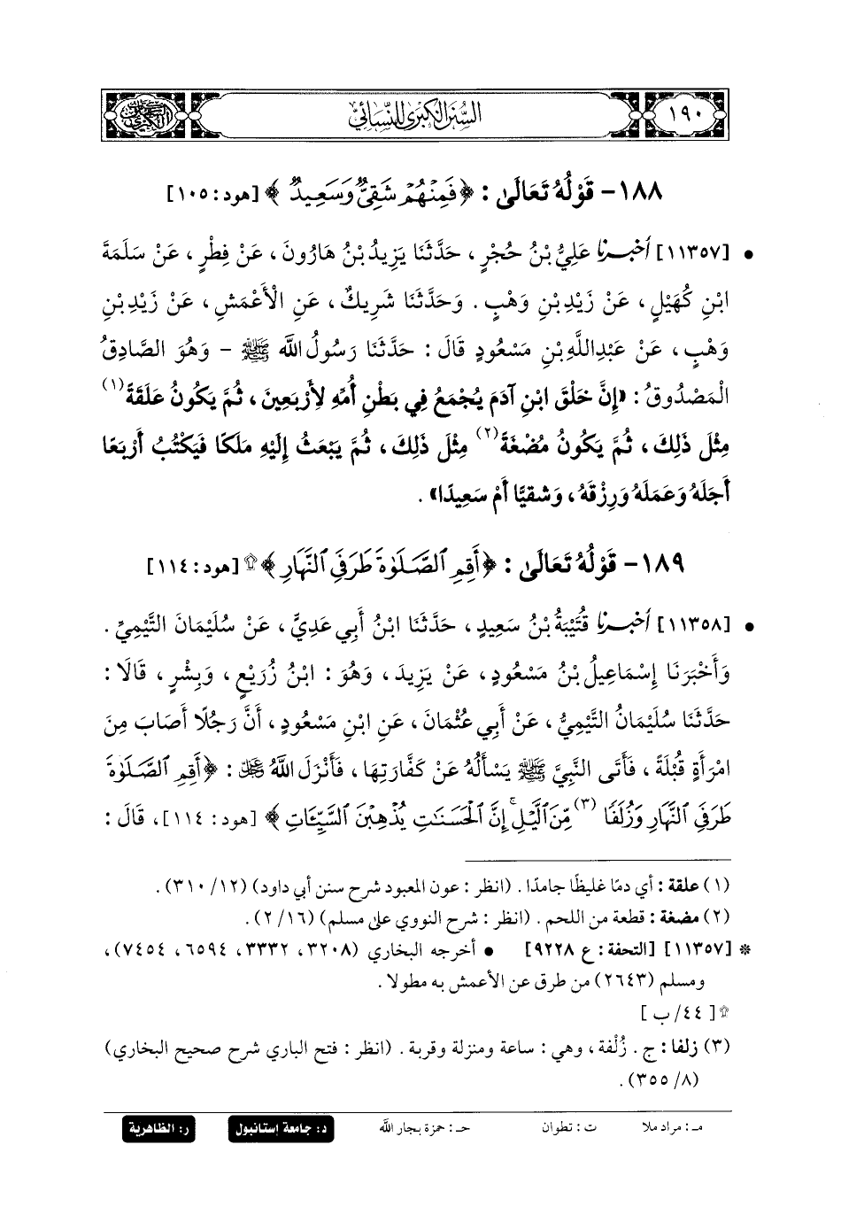 11357- أَخبَرنا عَليُّ بنُ حُجْرٍ، حَدثنا يَزِيدُ بنُ هَارُونَ، عَن فِطْرٍ، عَن سَلَمَةَ بنِ كُهَيْلٍ، عَن زَيْدِ بنِ وَهْبٍ، وَحَدثنا شَرِيكٌ، عَنِ الأَعْمَشِ، عَن زَيْدِ بنِ وَهْبٍ، عَن عَبدِ اللهِ بنِ مَسْعُودٍ، قَالَ: حَدثنا رَسُولُ اللهِ صَلى الله عَليه وسَلم وَهُوَ الصَّادِقُ المَصْدُوقُ: إِنَّ خَلْقَ ابنِ آدَمَ يُجْمَعُ فِي بَطْنِ أُمِّهِ لأَرْبَعِينَ، ثُمَّ يَكُونُ عَلَقَةً مِثْلَ ذَلِكَ، ثُمَّ يَكُونُ مُضْغَةً مِثْلَ ذَلِكَ، ثُمَّ يَبْعَثُ إِلَيْهِ مَلَكًا فَيَكْتُبُ أَرْبَعًا: أَجَلَهُ، وَعَمَلَهُ، وَرِزْقَهُ، وَشَقِيًّا أَمْ سَعِيدًا.