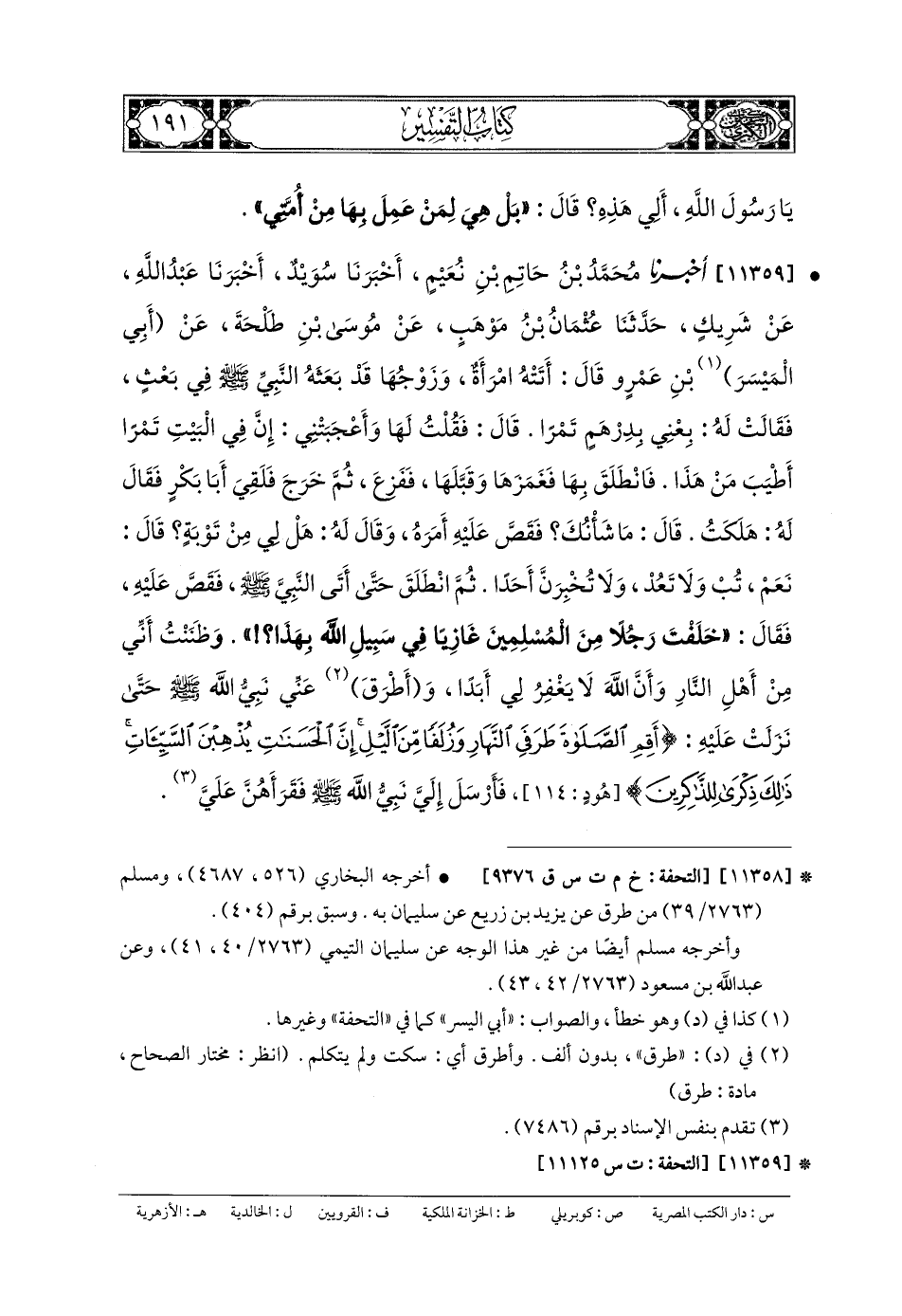 11359- أَخبَرنا مُحَمدُ بنُ حَاتِمِ بنِ نُعَيْمٍ، أَخبَرنا سُوَيْدٌ، أَخبَرنا عَبدُ اللهِ، عَن شَرِيكٍ، حَدثنا عُثْمَانُ بنُ مَوْهَبٍ، عَن مُوسَى بنِ طَلحَةَ، عَن أَبي اليَسَرِ (1) بنِ عَمْرٍو، قَالَ: أَتَتْهُ امْرَأَةٌ وَزَوْجُهَا قَدْ بَعَثَهُ النَّبيُّ صَلى الله عَليه وسَلم فِي بَعْثٍ، فَقَالَتْ لَهُ: بِعْنِي بِدِرْهَمٍ تَمْرًا، قَالَ: فَقُلْتُ لَهَا وَأَعْجَبَتْنِي: إِنَّ فِي البَيْتِ تَمْرًا أَطْيَبَ مِنْ هَذَا، فَانْطَلَقَ بِهَا فَغَمَزَهَا وَقَبَّلَهَا، فَفَزِعَ، ثُمَّ خَرَجَ، فَلَقِيَ أَبَا بَكْرٍ فَقَالَ لَهُ: هَلَكْتُ، قَالَ: مَا شَأْنُكَ؟ فَقَصَّ عَلَيْهِ أَمْرَهُ، وَقَالَ لَهُ: هَلْ لِي مِنْ تَوْبَةٍ؟ قَالَ: نَعَمْ، تُبْ وَلا تَعُدْ، وَلا تُخْبِرَنَّ أَحَدًا، ثُمَّ انْطَلَقَ حَتَّى أَتَى النَّبيَّ صَلى الله عَليه وسَلم، فَقَصَّ عَلَيْهِ، فَقَالَ: خَلَّفْتَ رَجُلاً مِنَ المُسْلِمِينَ غَازِيًا فِي سَبِيلِ اللهِ بِهَذَا؟ وَظَنَنْتُ أَنِّي مِنْ أَهْلِ النَّارِ، وَأَنَّ اللهَ لا يَغْفِرُ لِي أَبَدًا، وَأَطْرَقَ عَنِّي نَبِيُّ اللهِ صَلى الله عَليه وسَلم، حَتَّى نَزَلَتْ عَلَيْهِ: {وَأَقِمِ الصَّلاةَ طَرَفَيِ النَّهَارِ وَزُلَفًا مِنَ اللَّيْلِ إِنَّ الحَسَنَاتِ يُذْهِبْنَ السَّيِّئَاتِ ذَلِكَ ذِكْرَى لِلذَّاكِرِينَ} فَأَرْسَلَ إِلَيَّ نَبِيُّ اللهِ صَلى الله عَليه وسَلم، فَقَرَأَهُنَّ عَلَيَّ.