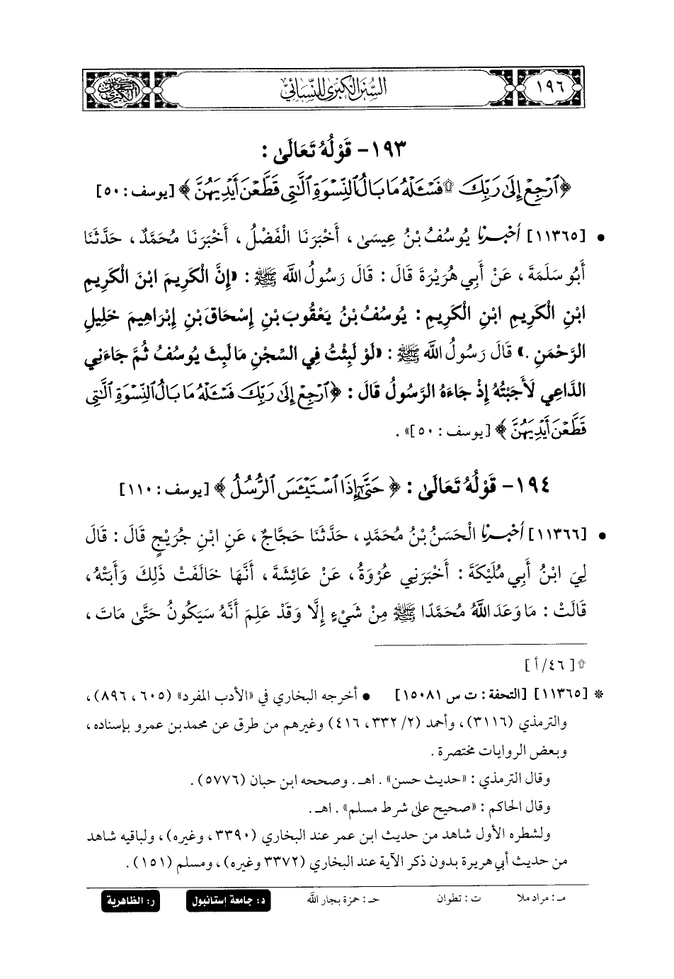 11365- أَخبَرنا يُوسُفُ بنُ عِيسَى، أَخبَرنا الفَضْلُ، أَخبَرنا مُحَمدٌ، حَدثنا أَبو سَلَمَةَ، عَن أَبي هُرَيرَةَ، قَالَ: قَالَ رَسُولُ اللهِ صَلى الله عَليه وسَلم: إِنَّ الكَرِيمَ ابنَ الكَرِيمِ ابنِ الكَرِيمِ ابنِ الكَرِيمِ يُوسُفُ بنُ يَعقُوبَ بنِ إِسحَاقَ بنِ إِبرَاهِيمَ خَلِيلِ الرَّحمَنِ، قَالَ رَسُولُ اللهِ صَلى الله عَليه وسَلم: لَوْ لَبِثْتُ فِي السِّجْنِ مَا لَبِثَ يُوسُفُ، ثُمَّ جَاءَنِي الدَّاعِي لأَجَبْتُهُ إِذْ {جَاءَهُ الرَّسُولُ قَالَ ارْجِعْ إِلَى رَبِّكَ فَاسْأَلْهُ مَا بَالُ النِّسْوَةِ اللاَّتِي قَطَّعْنَ أَيْدِيَهُنَّ}.