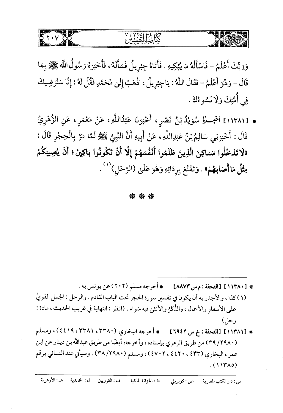 11381- أَخبَرنا سُوَيْدُ بنُ نَصْرٍ، أَخبَرنا عَبدُ اللهِ، عَن مَعْمَرٍ، عَنِ الزُّهْرِيِّ، قَالَ: أَخبَرني سَالِمُ بنُ عَبدِ اللهِ، عَن أَبيهِ؛ أَنَّ النَّبيَّ صَلى الله عَليه وسَلم لَمَّا مَرَّ بِالحِجْرِ قَالَ: لا تَدْخُلُوا مَسَاكِنَ الَّذِينَ ظَلَمُوا أَنْفُسَهُمْ إِلاَّ أَنْ تَكُونُوا بَاكِينَ، أَنْ يُصِيبَكُمْ مِثْلُ مَا أَصَابَهُمْ، وَتَقَنَّعَ بِرِدَائِهِ وَهُوَ عَلَى الرَّحْلِ.