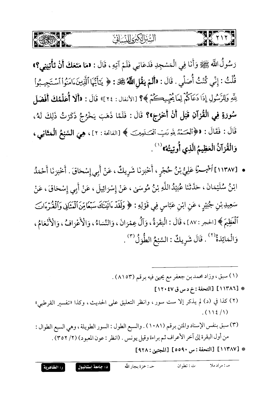 11387- أَخبَرنا عَليُّ بنُ حُجْرٍ، أَخبَرنا شَرِيكٌ، عَن أَبي إِسحَاقَ. أَخبَرنا أَحْمَدُ بنُ سُلَيمَانَ، حَدثنا عُبَيدُ اللهِ بنُ مُوسَى، عَن إِسرَائِيلَ، عَن أَبي إِسحَاقَ، عَن سَعِيدِ بنِ جُبَيرٍ، عَنِ ابنِ عَبَّاسٍ، فِي قَوْلِهِ: {وَلَقَدْ آتَيْنَاكَ سَبْعًا مِنَ المَثَانِي وَالقُرْآنَ العَظِيمَ} قَالَ: البَقَرَةُ، وَآلُ عِمْرَانَ، وَالنِّسَاءُ، وَالأَعْرَافُ، وَالأَنْعَامُ، وَالمَائِدَةُ، قَالَ شَرِيكٌ: السَّبْعُ الطُّوَلُ.