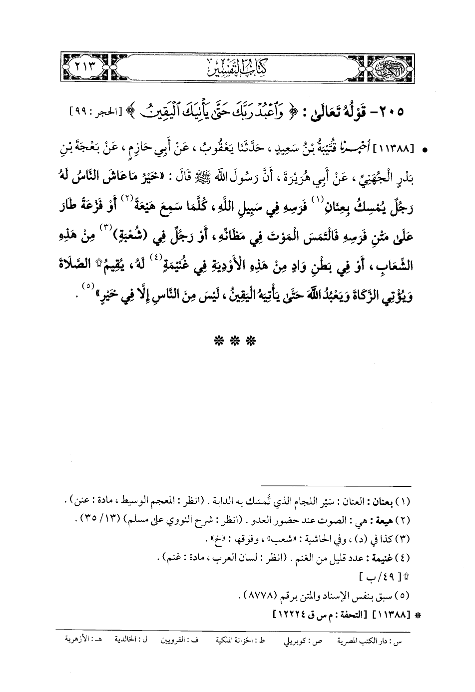 11388- أَخبَرنا قُتَيبَةُ بنُ سَعِيدٍ، حَدثنا يَعقُوبُ، عَن أَبي حَازِمٍ، عَن بَعْجَةَ بنِ بَدْرٍ الجُهَنِيِّ، عَن أَبي هُرَيرَةَ، أَنَّ رَسُولَ اللهِ صَلى الله عَليه وسَلم قَالَ: خَيْرُ مَا عَاشَ النَّاسُ لَهُ رَجُلٌ يُمْسِكُ بِعِنَانِ فَرَسِهِ فِي سَبِيلِ اللهِ، كُلَّمَا سَمِعَ هَيْعَةً أَوْ فَزْعَةً طَارَ عَلَى مَتْنِ فَرَسِهِ فَالتَمَسَ المَوْتَ فِي مَظَانِّهِ، أَوْ رَجُلٌ فِي شُعبَةٍ مِنْ هَذِهِ الشِّعَابِ، أَوْ فِي بَطْنِ وَادٍ مِنْ هَذِهِ الأَوْدِيَةِ، فِي غُنَيْمَةٍ لَهُ، يُقِيمُ الصَّلاةَ، وَيُؤْتِي الزَّكَاةَ، وَيَعْبُدُ اللهَ، حَتَّى يَأْتِيَهُ اليَقِينُ، لَيْسَ مِنَ النَّاسِ إِلاَّ فِي خَيْرٍ.
