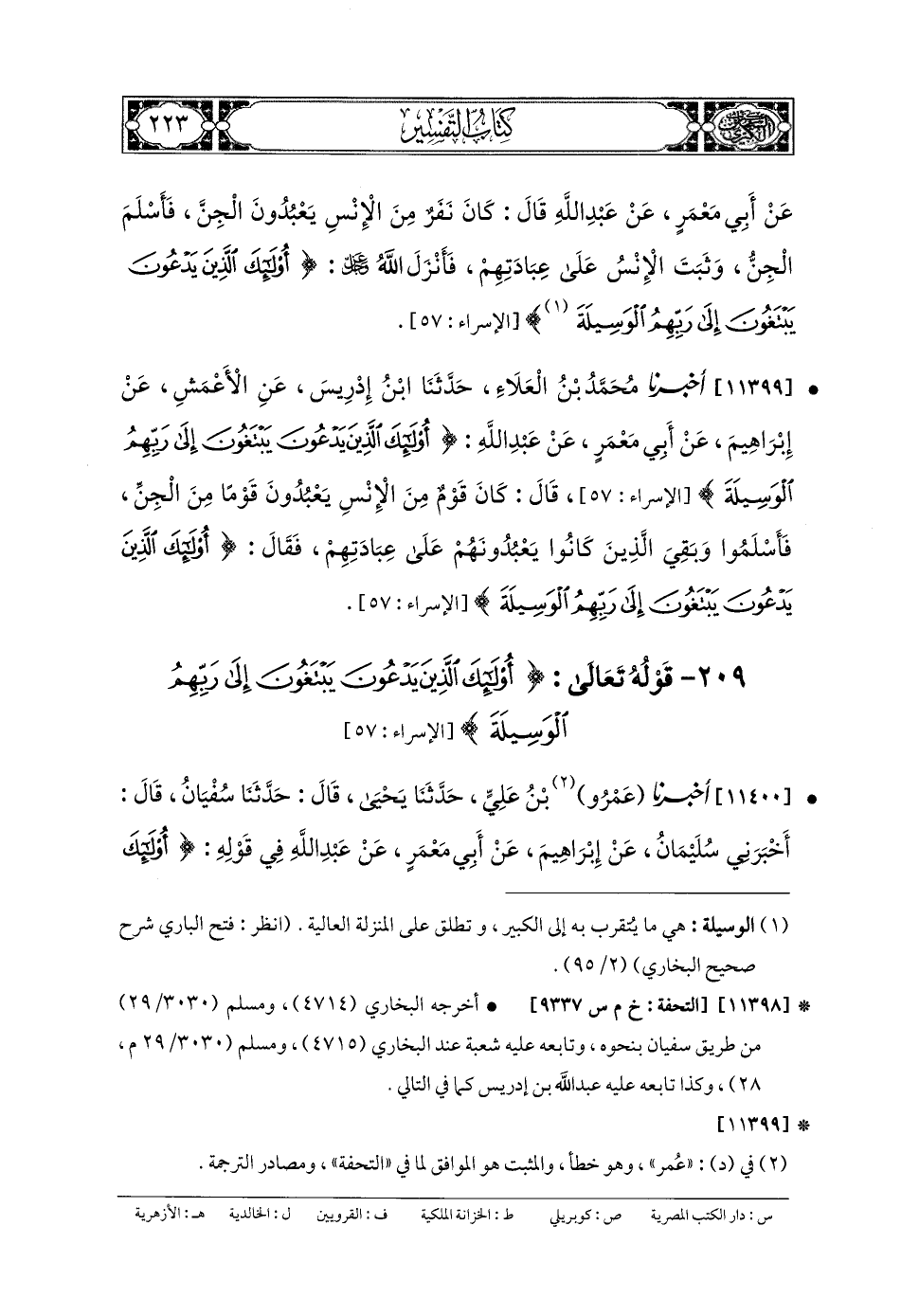 11399- أَخبَرنا مُحَمدُ بنُ العَلاءِ، حَدثنا ابنُ إِدرِيسَ، عَنِ الأَعْمَشِ، عَن إِبرَاهِيمَ، عَن أَبي مَعْمَرٍ، عَن عَبدِ اللهِ، {أُولَئِكَ الَّذِينَ يَدْعُونَ يَبْتَغُونَ إِلَى رَبِّهِمُ الوَسِيلَةَ} قَالَ: كَانَ قَوْمٌ مِنَ الإِنْسِ يَعْبُدُونَ قَوْمًا مِنَ الجِنِّ، فَأَسْلَمُوا، وَبَقِيَ الَّذِينَ كَانُوا يَعْبُدُونَهُمْ عَلَى عِبَادَتِهِمْ، فَقَالَ: {أُولَئِكَ الَّذِينَ يَدْعُونَ يَبْتَغُونَ إِلَى رَبِّهِمُ الوَسِيلَةَ}.
