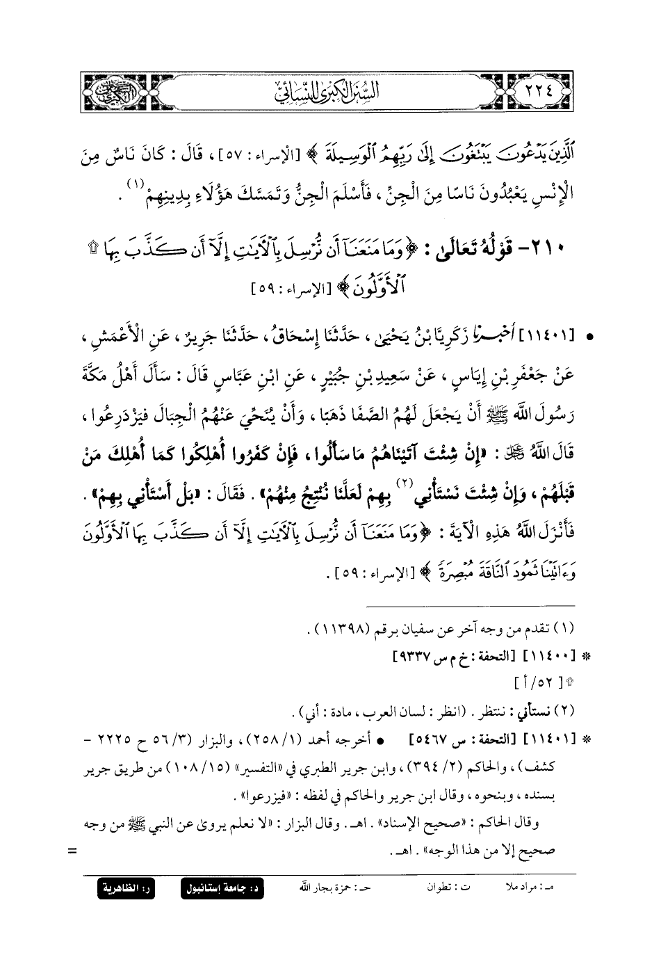11401- أَخبَرنا زَكَرِيَّا بنُ يَحيَى، حَدثنا إِسحَاقُ، حَدثنا جَرِيرٌ، عَنِ الأَعْمَشِ، عَن جَعفَرِ بنِ إِيَاسٍ، عَن سَعِيدِ بنِ جُبَيرٍ، عَنِ ابنِ عَبَّاسٍ، قَالَ: سَأَلَ أَهْلُ مَكَّةَ رَسُولَ اللهِ صَلى الله عَليه وسَلم أَنْ يَجْعَلَ لَهُمُ الصَّفَا ذَهَبًا، وَأَنْ يُنَحِّيَ عَنهُمُ الجِبَالَ، فَيَزْدَرِعُوا، قَالَ اللهُ عَزَّ وَجَلَّ: إِنْ شِئْتَ آتَيْنَاهُمْ مَا سَأَلُوا، فَإِنْ كَفَرُوا أُهْلِكُوا كَمَا أُهْلِكَ مَنْ قَبْلَهُمْ، وَإِنْ شِئْتَ نَسْتَأْنِي بِهِمْ لَعَلَّنَا نَنْتِجُ مِنْهُمْ، فَقَالَ: بَلْ أَسْتَأْنِي بِهِمْ، فَأَنْزَلَ اللهُ هَذِهِ الآيَةَ: {وَمَا مَنَعَنَا أَنْ نُرْسِلَ بِالآيَاتِ إِلاَّ أَنْ كَذَّبَ بِهَا الأَوَّلُونَ وَآتَيْنَا ثَمُودَ النَّاقَةَ مُبْصِرَةً}.