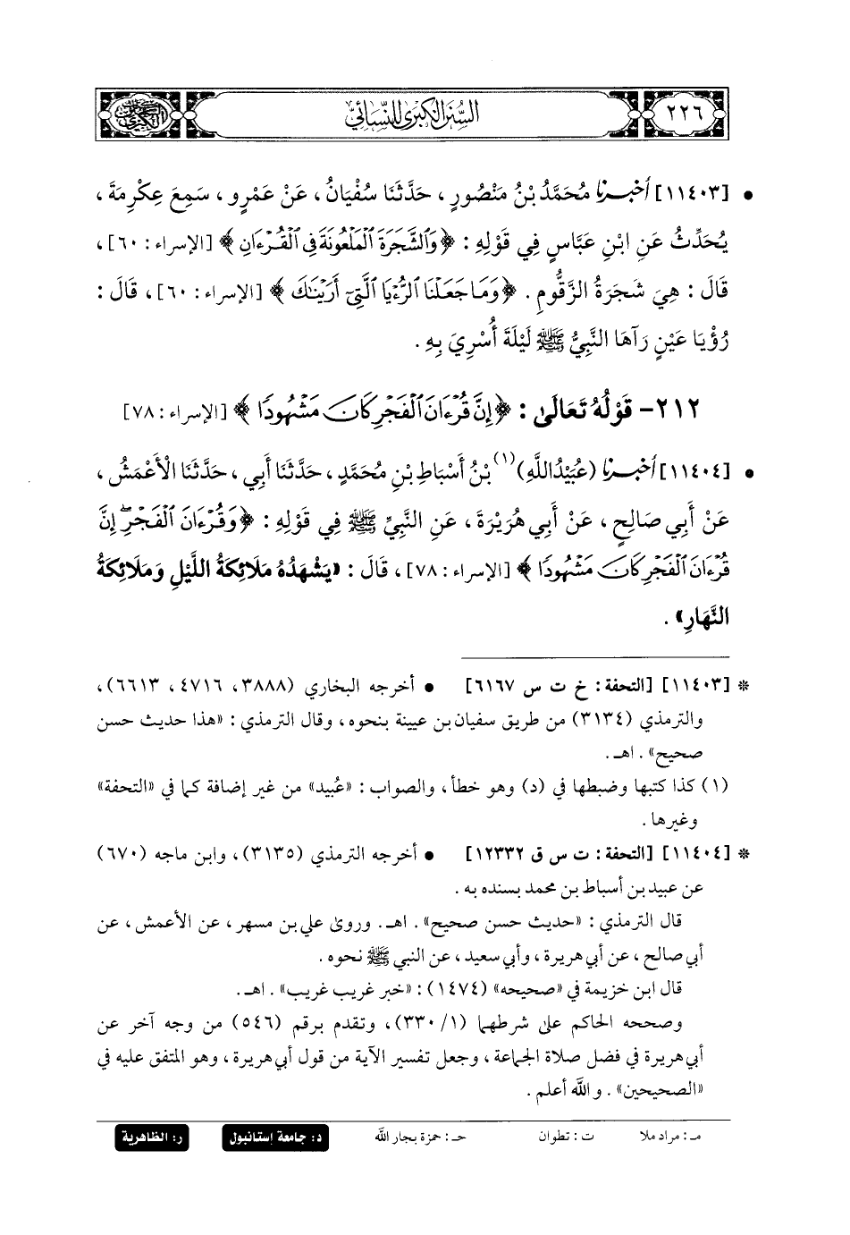 11404- أَخبَرنا عُبَيدُ (1) بنُ أَسْبَاطِ بنِ مُحَمدٍ، حَدثنا أَبي، حَدثنا الأَعْمَشُ، عَن أَبي صَالِحٍ، عَن أَبي هُرَيرَةَ، عَنِ النَّبيِّ صَلى الله عَليه وسَلم فِي قَوْلِهِ: {وَقُرْآنَ الفَجْرِ إِنَّ قُرْآنَ الفَجْرِ كَانَ مَشْهُودًا} قَالَ: يَشْهَدُهُ مَلائِكَةُ اللَّيْلِ وَمَلائِكَةُ النَّهَارِ.