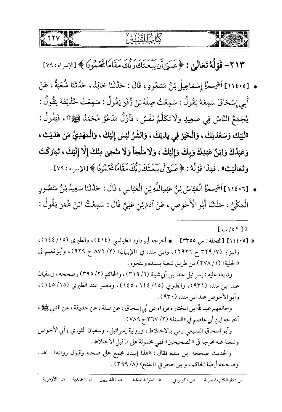 11405- أَخبَرنا إِسمَاعِيلُ بنُ مَسْعُودٍ، قَالَ: حَدثنا خَالِدٌ، حَدثنا شُعبَةُ، عَن أَبي إِسحَاقَ، سَمِعَهُ يَقُولُ: سَمِعْتُ صِلَةَ بْنَ زُفَرَ يَقُولُ: سَمِعْتُ حُذَيْفَةَ يَقُولُ: يُجْمَعُ النَّاسُ فِي صَعِيدٍ وَلا تَكَلَّمُ نَفْسٌ، فَأَوَّلُ مَدْعُوٍّ مُحَمدٌ صَلى الله عَليه وسَلم، فَيَقُولُ: لَبَّيْكَ وَسَعْدَيْكَ، وَالخَيْرُ فِي يَدَيْكَ، وَالشَّرُّ لَيْسَ إِلَيْكَ، وَالمَهْدِيُّ مَنْ هَدَيْتَ، وَعَبدُكَ وَابْنُ عَبدِكَ، وَبِكَ وَإِلَيْكَ، وَلا مَلْجَأَ وَلا مَنْجَى مِنْكَ إِلاَّ إِلَيْكَ، تَبَارَكْتَ وَتَعَالَيْتَ، فَهَذَا قَوْلُهُ: {عَسَى أَنْ يَبْعَثَكَ رَبُّكَ مَقَامًا مَحْمُودًا}.
