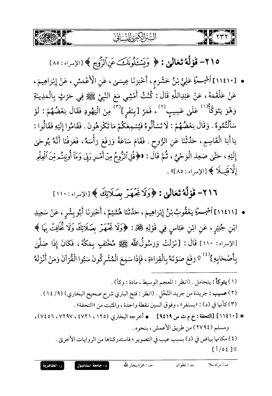 11410- أَخبَرنا عَليُّ بنُ خَشْرَمٍ، أَخبَرنا عِيسَى، عَنِ الأَعْمَشِ، عَن إِبرَاهِيمَ، عَن عَلْقَمَةَ، عَن عَبدِ اللهِ، قَالَ: كُنْتُ أَمْشِي مَعَ النَّبيِّ صَلى الله عَليه وسَلم فِي حَرْثٍ بِالمَدِينَةِ وَهُوَ يَتَوَكَّأُ عَلَى عَسِيبٍ، فَمَرَّ بِنَفَرٍ مِنَ اليَهُودِ، فَقَالَ بَعْضُهُمْ: لَوْ سَأَلْتُمُوهُ، وَقَالَ بَعْضُهُمْ: لا تَسْأَلُوهُ فَيُسْمِعُكُمْ مَا تَكْرَهُونَ، فَقَامُوا إِلَيْهِ، فَقَالُوا: يَا أَبَا القَاسِمِ، حَدِّثْنَا عَنِ الرُّوحِ، فَقَامَ سَاعَةً وَرَفَعَ رَأْسَهُ، فَعَرَفْنَا أَنَّهُ يُوحَى إِلَيْهِ، حَتَّى صَعِدَ الوَحْيُ، ثُمَّ قَالَ: {الرُّوحُ مِنْ أَمْرِ رَبِّي وَمَا أُوتِيتُمْ مِنَ العِلْمِ إِلاَّ قَلِيلاً}.