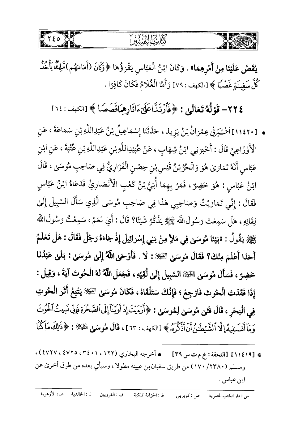 11420 - أَخبَرني عِمْرَانُ بنُ يَزِيدَ، حَدثنا إِسمَاعِيلُ بنُ عَبدِ اللهِ بنِ سَمَاعَةَ، عَنِ الأَوْزَاعِيِّ، قَالَ: أَخبَرني ابنُ شِهَابٍ، عَن عُبَيدِ اللهِ بنِ عَبدِ اللهِ بنِ عُتْبَةَ، عَنِ ابنِ عَبَّاسٍ، أَنَّهُ تَمَارَى هُوَ وَالحُرُّ بنُ قَيْسِ بنِ حِصْنٍ الفَزَارِيُّ فِي صَاحِبِ مُوسَى، قَالَ ابنُ عَبَّاسٍ: هُوَ خَضِرٌ، فَمَرَّ بِهِمَا أُبَيُّ بنُ كَعْبٍ الأَنْصَارِيُّ، فَدَعَاهُ ابنُ عَبَّاسٍ، فَقَالَ: إِنِّي تَمَارَيْتُ وَصَاحِبِي هَذَا فِي صَاحِبِ مُوسَى الَّذِي سَأَلَ السَّبِيلَ إِلَى لِقَائِهِ، هَلْ سَمِعْتَ رَسُولَ اللهِ صَلى الله عَليه وسَلم يَذْكُرُ شَيْئًا؟ قَالَ: أَيْ نَعَمْ، سَمِعْتُ رَسُولَ اللهِ صَلى الله عَليه وسَلم يَقُولُ: بَيْنَا مُوسَى فِي مَلأٍ مِنْ بَنِي إِسرَائِيلَ إِذْ جَاءَهُ رَجُلٌ فَقَالَ: هَلْ تَعْلَمُ أَحَدًا أَعْلَمَ مِنْكَ؟ فَقَالَ مُوسَى عَلَيْهِ السَّلامُ: لا، فَأَوْحَى اللهُ إِلَى مُوسَى: بَلَى عَبدُنَا خَضِرٌ، فَسَأَلَ مُوسَى عَلَيْهِ السَّلامُ السَّبِيلَ إِلَى لُقِيِّهِ، فَجَعَلَ اللهُ لَهُ الحُوتَ آيَةً، وَقِيلَ: إِذَا فَقَدْتَ الحُوتَ، فَارْجِعْ فَإِنَّكَ سَتَلْقَاهُ، فَكَانَ مُوسَى عَلَيْهِ السَّلامُ يَتْبَعُ أَثَرَ الحُوتِ فِي البَحْرِ، قَالَ فَتَى مُوسَى لِمُوسَى: {أَرَأَيْتَ إِذْ أَوَيْنَا إِلَى الصَّخْرَةِ فَإِنِّي نَسِيتُ الحُوتَ وَمَا أَنْسَانِيهُ إِلاَّ الشَّيْطَانُ أَنْ أَذْكُرَهُ} قَالَ مُوسَى عَلَيْهِ السَّلامُ: {ذَلِكَ مَا كُنَّا نَبْغِ فَارْتَدَّا عَلَى آثَارِهِمَا قَصَصًا فَوَجَدَا} خَضِرًا فَكَانَ مِنْ شَأْنِهِمَا مَا قَصَّ اللهُ فِي كِتَابِهِ.