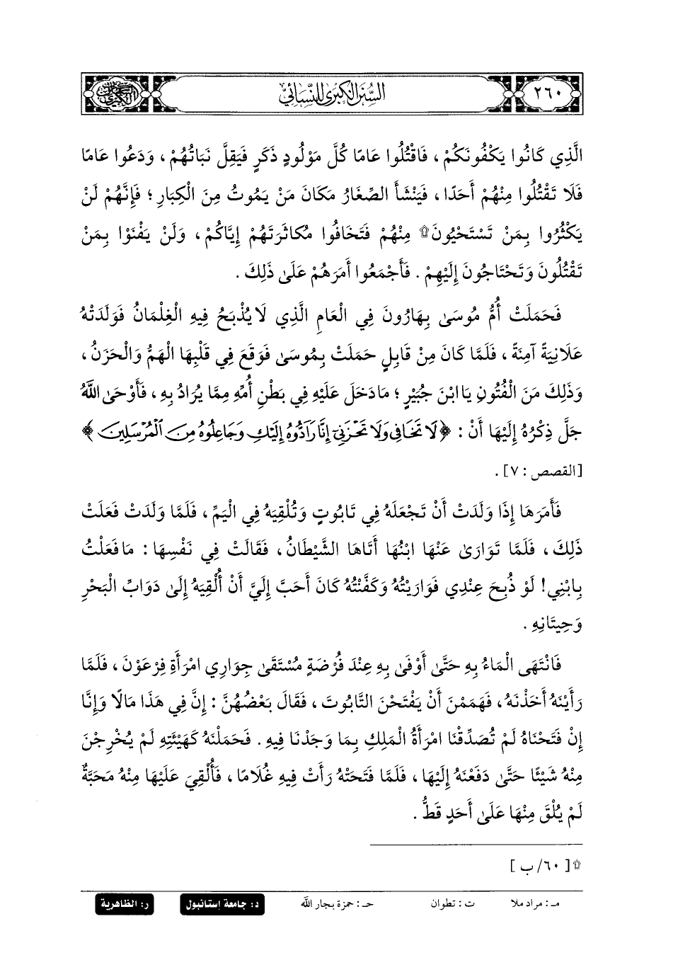 فَلَمَّا كَانَ مِنْ قَابِلٍ، حَمَلَتْ بِمُوسَى، فَوَقَعَ فِي قَلْبِهَا الهَمُّ وَالحُزْنُ، وَذَلِكَ مِنَ الفُتُونِ يَا ابنَ جُبَيرٍ، مَا دَخَلَ عَلَيْهِ فِي بَطْنِ أُمِّهِ مِمَّا يُرَادُ بِهِ، فَأَوْحَى اللهُ جَلَّ ذِكْرُهُ إِلَيْهَا، أَنْ لا تَخَافِي {وَلا تَحْزَنِي إِنَّا رَادُّوهُ إِلَيْكِ وَجَاعِلُوهُ مِنَ المُرْسَلِينَ}، فَأَمَرَهَا إِذَا وَلَدَتْ أَنْ تَجْعَلَهُ فِي تَابُوتٍ، وَتُلْقِيَهُ فِي اليَمِّ، فَلَمَّا وَلَدَتْ فَعَلَتْ ذَلِكَ، فَلَمَّا تَوَارَى عَنهَا ابنُهَا، أَتَاهَا الشَّيْطَانُ، فَقَالَتْ فِي نَفْسِهَا: مَا فَعَلْتُ بِابْنِي، لَوْ ذُبِحَ عِنْدِي، فَوَارَيْتُهُ وَكَفَّنْتُهُ، كَانَ أَحَبَّ إِلَيَّ أَنْ أُلْقِيَهُ إِلَى دَوَابِّ البَحْرِ وَحِيتَانِهِ، فَانْتَهَى المَاءُ بِهِ، حَتَّى أَوْفَى بِهِ عِنْدَ فُرْضَةِ مُسْتَقَى جَوَارِي امْرَأَةِ فِرْعَوْنَ، فَلَمَّا رَأَيْنَهُ أَخَذْنَهُ، فَهَمَمْنَ أَنْ يَفْتَحْنَ التَّابُوتَ، فَقَالَ بَعْضُهُنَّ: إِنَّ فِي هَذَا مَالاً، وَإِنَّا إِنْ فَتَحْنَاهُ، لَمْ تُصَدِّقْنَا امْرَأَةُ المَلِكِ بِمَا وَجَدْنَا فِيهِ، فَحَمَلْنَهُ كَهَيْئَتِهِ لَمْ يُخْرِجْنَ مِنْهُ شَيْئًا، حَتَّى دَفَعْنَهُ إِلَيْهَا، فَلَمَّا فَتَحَتْهُ رَأَتْ فِيهِ غُلامًا، فَأُلْقِيَ عَلَيْهَا مِنْهُ مَحَبَّةٌ لَمْ يُلْقَ مِنْهَا عَلَى أَحَدٍ قَطُّ، وَأَصْبَحَ فُؤَادُ أُمِّ مُوسَى فَارِغًا مِنْ ذِكْرِ كُلِّ شَيْءٍ، إِلاَّ مِنْ ذِكْرِ مُوسَى، فَلَمَّا سَمِعَ الذَّبَّاحُونَ بِأَمْرِهِ، أَقْبَلُوا بِشِفَارِهِمْ إِلَى امْرَأَةِ فِرْعَوْنَ لِيَذْبَحُوهُ، وَذَلِكَ مِنَ الفُتُونِ يَا ابنَ جُبَيرٍ، فَقَالَتْ لَهُمْ: أَقِرُّوهُ، فَإِنَّ هَذَا الوَاحِدَ لا يَزِيدُ فِي بَنِي إِسرَائِيلَ، حَتَّى آتِيَ فِرْعَوْنَ فَأَسْتَوْهِبَهُ مِنْهُ، فَإِنْ وَهَبَهُ لِي كُنْتُمْ قَدْ أَحْسَنْتُمْ وَأَجْمَلْتُمْ، وَإِنْ أَمَرَ بِذَبْحِهِ لَمْ أَلُمْكُمْ، فَأَتَتْ فِرْعَوْنَ فَقَالَتْ: {قُرَّةُ عَيْنٍ لِي وَلَكَ}، فَقَالَ فِرْعَوْنُ: يَكُونُ لَكِ، فَأَمَّا لِي فَلا حَاجَةَ لِي، فَقَالَ رَسُولُ اللهِ صَلى الله عَليه وسَلم: وَالَّذِي يُحْلَفُ بِهِ، لَوْ أَقَرَّ فِرْعَوْنُ أَنْ يَكُونَ لَهُ قُرَّةَ عَيْنٍ كَمَا أَقَرَّتِ امْرَأَتُهُ، لَهَدَاهُ اللهُ كَمَا هَدَاهَا، وَلَكِنَّ اللهَ حَرَمَهُ ذَلِكَ، فَأَرْسَلَتْ إِلَى مَنْ حَوْلَهَا، إِلَى كُلِّ امْرَأَةٍ لَهَا لَبَنٌ، تَخْتَارُ لَهُ ظِئْرًا، فَجَعَلَ كُلَّمَا أَخَذَتْهُ امْرَأَةٌ مِنْهُنَّ لِتُرْضِعَهُ، لَمْ يُقْبِلْ عَلَى ثَدْيِهَا، حَتَّى أَشْفَقَتِ امْرَأَةُ فِرْعَوْنَ أَنْ يَمْتَنِعَ مِنَ اللَّبَنِ فَيَمُوتَ، فَأَحْزَنَهَا ذَلِكَ، فَأَمَرَتْ بِهِ فَأُخْرِجَ إِلَى السُّوقِ وَمَجْمَعِ النَّاسِ، تَرْجُو أَنْ تَجِدَ لَهُ ظِئْرًا تَأْخُذُهُ مِنْهَا، فَلَمْ يُقْبَلْ، فَأَصْبَحَتْ أُمُّ مُوسَى وَالِهًا، فَقَالَتْ لأُخْتِهِ: قُصِّي أَثَرَهُ وَاطْلُبِيهِ، هَلْ تَسْمَعِينَ لَهُ ذِكْرًا، أَحَيٌّ ابنِي أَمْ أَكَلَتْهُ الدَّوَابُّ، وَنَسِيتْ مَا كَانَ اللهُ وَعَدَهَا فِيهِ،