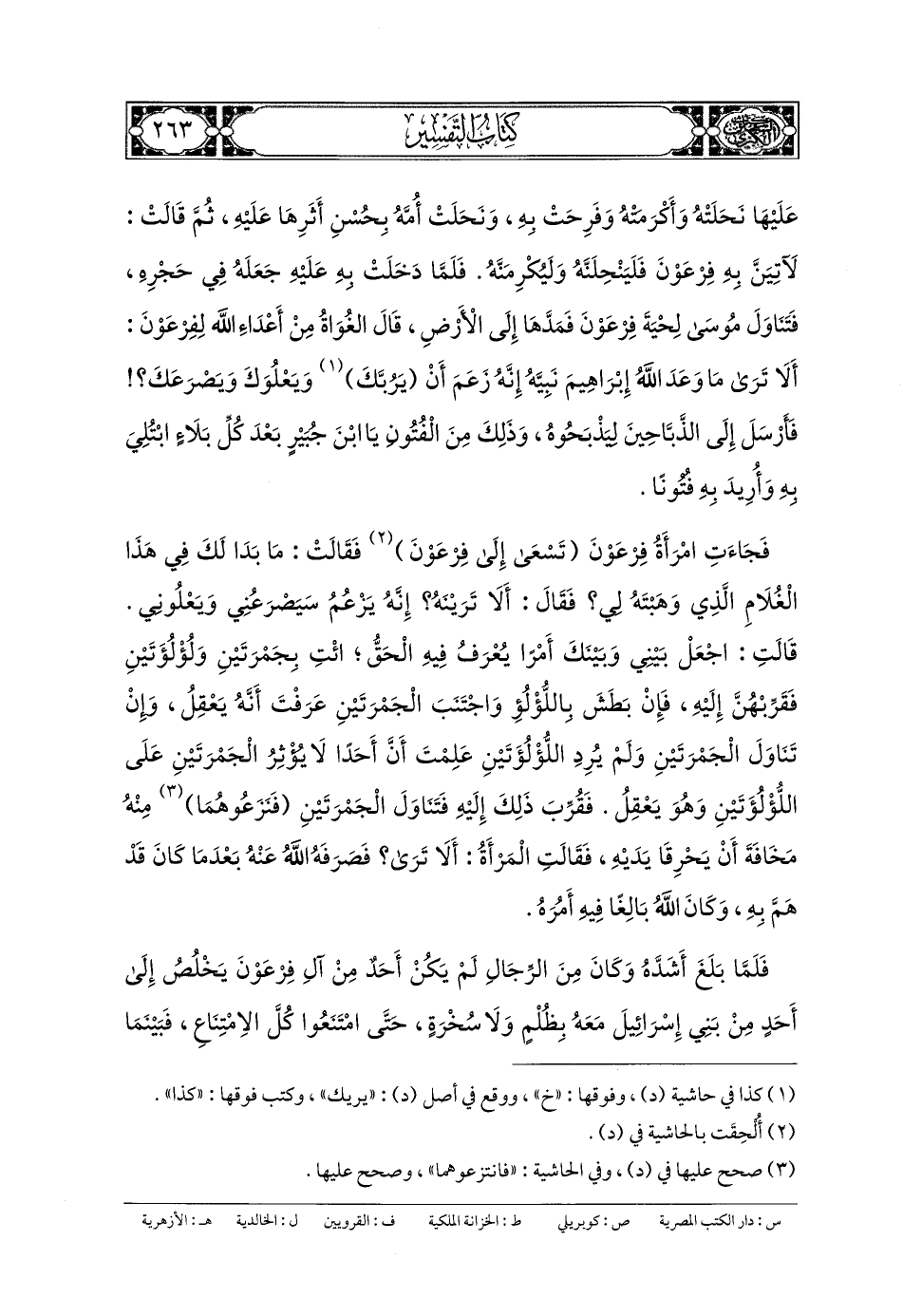 قَالَ الغُوَاةُ مِنْ أَعْدَاءِ اللهِ لِفِرْعَوْنَ: أَلا تَرَى مَا وَعَدَ اللهُ إِبرَاهِيمَ نَبِيَّهُ، إِنَّهُ زَعَمَ أَنْ يَرُبَّكَ وَيَعْلُوكَ وَيَصْرَعَكَ، فَأَرْسَلَ إِلَى الذَّبَّاحِينَ لِيَذْبَحُوهُ، وَذَلِكَ مِنَ الفُتُونِ يَا ابنَ جُبَيرٍ، بَعْدَ كُلِّ بَلاءٍ ابْتُلِيَ بِهِ، وَأُرِيدَ بِهِ فُتُونًا، فَجَاءَتِ امْرَأَةُ فِرْعَوْنَ، تسعى إلى فِرْعَوْنَ فَقَالَتْ: مَا بَدَا لَكَ فِي هَذَا الغُلامِ الَّذِي وَهَبْتَهُ لِي؟ فَقَالَ: أَلا تَرَيْنَهُ، إِنَّهُ يَزْعُمُ سَيَصْرَعُنِي وَيَعْلُونِي، قَالَتِ: اجْعَلْ بَيْنِي وَبَيْنَكَ أَمْرًا يُعْرَفُ فِيهِ الحَقُّ، ائْتِ بِجَمْرَتَيْنِ وَلُؤْلُؤَتَيْنِ، فَقَرِّبْهُنَّ إِلَيْهِ، فَإِنْ بَطَشَ بِاللُّؤْلُؤِ، وَاجْتَنَبَ الجَمْرَتَيْنِ، عَرَفْتَ أَنَّهُ يَعقِلُ، وَإِنْ تَنَاوَلَ الجَمْرَتَيْنِ، وَلَمْ يُرِدِ اللُّؤْلُؤَتَيْنِ، عَلِمْتَ أَنَّ أَحَدًا لا يُؤْثِرُ الجَمْرَتَيْنِ عَلَى اللُّؤْلُؤَتَيْنِ وَهُوَ يَعقِلُ، فَقُرِّبَ ذَلِكَ إِلَيْهِ، فَتَنَاوَلَ الجَمْرَتَيْنِ، فَنَزَعُوهُمَا مِنْهُ مَخَافَةَ أَنْ يُحْرِقَا يَدَيْهِ، فَقَالَتِ المَرْأَةُ: أَلا تَرَى؟! فَصَرَفَهُ اللهُ عَنهُ بَعْدَ مَا كَانَ قَدْ هَمَّ بِهِ، وَكَانَ اللهُ بَالِغًا فِيهِ أَمْرَهُ، فَلَمَّا بَلَغَ أَشُدَّهُ، وَكَانَ مِنَ الرِّجَالِ، لَمْ يَكُنْ أَحَدٌ مِنْ آلِ فِرْعَوْنَ يَخْلُصُ إِلَى أَحَدٍ مِنْ بَنِي إِسرَائِيلَ مَعَهُ بِظُلْمٍ وَلا سُخْرَةٍ، حتى امْتَنَعُوا كُلَّ الاِمْتِنَاعِ، فَبَيْنَمَا مُوسَى عَلَيْهِ السَّلامُ يَمْشِي فِي نَاحِيَةِ المَدِينَةِ، إِذا هُوَ بِرَجُلَيْنِ يَقْتَتِلانِ، أَحَدُهُمَا فِرْعَوْنِيٌّ، وَالآخَرُ إِسرَائِيلِيٌّ، فَاسْتَغَاثَهُ الإِسرَائِيلِيُّ عَلَى الفِرْعَوْنِيِّ، فَغَضِبَ مُوسَى عَلَيْهِ السَّلامُ غَضَبًا شَدِيدًا، لأَنَّهُ تَنَاوَلَهُ، وَهُوَ يَعْلَمُ مَنْزِلَهُ مِنْ بَنِي إِسرَائِيلَ، وَحِفْظَهُ لَهُمْ، لا يَعْلَمُ النَّاسُ إِلاَّ أَنَّمَا ذَلِكَ مِنَ الرَّضَاعِ إِلاَّ أُمُّ مُوسَى، إِلاَّ أَنْ يَكُونَ اللهُ سُبْحَانَهُ أَطْلَعَ مُوسَى عَلَيْهِ السَّلامُ مِنْ ذَلِكَ عَلَى مَا لَمْ يُطْلِعْ عَلَيْهِ غَيْرَهُ، فوَكَزَ مُوسَى الفِرْعَوْنِيَّ، فَقَتَلَهُ، وَلَيْسَ يَرَاهُمَا أَحَدٌ إِلاَّ اللهُ عَزَّ وَجَلَّ وَالإِسرَائِيلِيُّ، فَقَالَ مُوسَى حِينَ قَتَلَ الرَّجُلَ: {هَذَا مِنْ عَمَلِ الشَّيْطَانِ إِنَّهُ عَدُوٌّ مُضِلٌّ مُبِينٌ}، ثُمَّ قَالَ: {رَبِّ إِنِّي ظَلَمْتُ نَفْسِي فَاغْفِرْ لِي فَغَفَرَ لَهُ إِنَّهُ هُوَ الغَفُورُ الرَّحِيمُ} {فَأَصْبَحَ فِي المَدِينَةِ خَائِفًا يَتَرَقَّبُ} الأَخبَارَ، فَأُتِيَ فِرْعَوْنُ، فَقِيلَ لَهُ: إِنَّ بَنِي إِسرَائِيلَ قَتَلُوا رَجُلاً مِنْ آلِ فِرْعَوْنَ، فَخُذْ لَنَا بِحَقِّكَ، وَلا تُرَخِّصْ لَهُمْ، فَقَالَ: ابْغُونِي قَاتِلَهُ مَنْ شَهِدَ عَلَيْهِ، فَإِنَّ المَلِكَ وَإِنْ كَانَ صَفْوُهُ مَعَ قَوْمِهِ، لا يَسْتَقِيمُ لَهُ أَنْ يَقِيدَ بِغَيْرِ بَيِّنَةٍ، وَلا ثَبْتٍ، فَاطْلُبُوا لِي عِلْمَ ذَلِكَ، آخُذْ لَكُمْ بِحَقِّكُمْ،