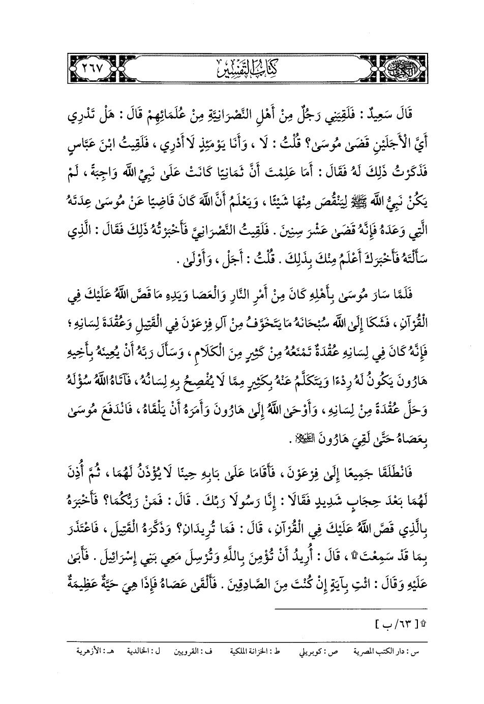 فَانْدَفَعَ مُوسَى بِعَصَاهُ، حَتَّى لَقِيَ هَارُونَ عَلَيْهِ السَّلامُ، فَانْطَلَقَا جَمِيعًا إِلَى فِرْعَوْنَ، فَأَقَامَا عَلَى بَابِهِ حِينًا لا يُؤْذَنُ لَهُمَا، ثُمَّ أَذِنَ لَهُمَا بَعْدَ حِجَابٍ شَدِيدٍ، فَقَالا: إِنَّا رَسُولا رَبِّكَ، قَالَ: فَمَنْ رَبُّكَمَا؟ فَأَخبَرَاهُ بِالَّذِي قَصَّ اللهُ عَلَيْكَ فِي القُرْآنِ، قَالَ: فَمَا تُرِيدَانِ، وَذَكَّرَهُ القَتِيلَ، فَاعْتَذَرَ بِمَا قَدْ سَمِعْتَ، قَالَ: أُرِيدُ أَنْ تُؤْمِنَ بِاللهِ، وَتُرْسَلَ مَعِي بَنِي إِسرَائِيلَ، فَأَبَى عَلَيْهِ، وَقَالَ: ائْتِ بِآيَةٍ إِنْ كُنْتَ مِنَ الصَّادِقِينَ، فَأَلْقَى عَصَاهُ، فَإِذَا هِيَ حَيَّةٌ عَظِيمَةٌ فَاغِرَةٌ فَاهَا مُسْرِعَةٌ إِلَى فِرْعَوْنَ، فَلَمَّا رَآهَا فِرْعَوْنُ قَاصِدَةً إِلَيْهِ خَافَهَا، فَاقْتَحَمَ عَن سَرِيرِهِ، وَاسْتَغَاثَ بِمُوسَى أَنْ يَكُفُّهَا عَنهُ، فَفَعَلَ، ثُمَّ أَخْرَجَ يَدَهُ مِنْ جَيْبِهِ، فَرَآهَا بَيْضَاءَ مِنْ غَيْرِ سُوءٍ، يَعْنِي مِنْ غَيْرِ بَرَصٍ، ثُمَّ رَدَّهَا، فَعَادَتْ إِلَى لَوْنِهَا الأَوَّلِ، فَاسْتَشَارَ المَلأَ حَوْلَهُ فِيمَا رَأَى، فَقَالُوا لَهُ: هَذَانِ سَاحِرَانِ يُرِيدَانِ أَنْ يُخْرِجَاكُمْ مِنْ أَرْضِكُمْ بِسِحْرِهِمَا، وَيَذْهَبَا بِطَرِيقَتِكُمُ المُثْلَى، يَعْنِي مُلْكَهُمُ الَّذِي هُمْ فِيهِ وَالعَيْشَ، فَأَبَوْا عَلَى مُوسَى أَنْ يُعْطُوهُ شَيْئًا مِمَّا طَلَبَ، وَقَالُوا لَهُ: اجْمَعْ لَهُمَا السَّحَرَةَ، فَإِنَّهُمْ بِأَرْضِكَ كَثِيرٌ، حَتَّى تغْلِبَ بسِحْرُكَ سِحْرَهُمَا، فَأَرْسَلَ فِي المَدَائِنِ، فَحشر لَهُ كُلُّ سَاحِرٍ مُتَعَالِمٍ، فَلَمَّا أَتَوْا فِرْعَوْنَ قَالُوا: بِمَ يَعْمَلُ هَذَا السَّاحِرُ؟ قَالُوا: يَعْمَلُ بِالحَيَّاتِ، قَالُوا: فَلا وَاللهِ، مَا أَحَدٌ فِي الأَرْضِ يَعْمَلُ بِالسِّحْرِ بِالحَيَّاتِ وَالحِبَالِ وَالعِصِيِّ الَّذِي نَعْمَلُ، وَمَا أَجْرُنَا إِنْ نَحْنُ غَلَبْنَا؟ قَالَ لَهُمْ: أَنْتُمْ أَقَارِبِي وَخَاصَّتِي، وَأنَا صَانِعٌ إِلَيْكُمْ كُلَّ شَيْءٍ أَحْبَبْتُمْ، فَتَوَاعَدُوا يَوْمَ الزِّينَةِ، وَأَنْ يُحْشَرَ النَّاسُ ضُحًى.