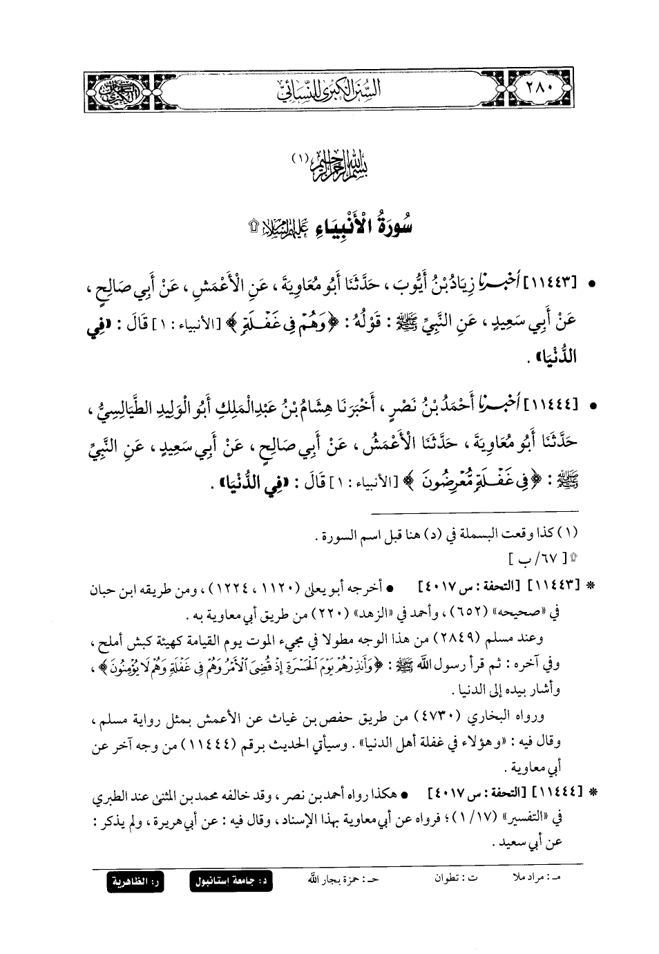 11444- أَخبَرنا أَحْمَدُ بنُ نَصْرٍ، أَخبَرنا هِشَامُ بنُ عَبدِ المَلِكِ أَبو الوَلِيدِ الطَّيَالِسِيُّ، حَدثنا أَبو مُعاويَةَ، حَدثنا الأَعْمَشُ، عَن أَبي صَالِحٍ، عَن أَبي سَعِيدٍ، عَنِ النَّبيِّ صَلى الله عَليه وسَلم: {فِي غَفْلَةٍ مُعْرِضُونَ}، قَالَ: فِي الدُّنْيَا.