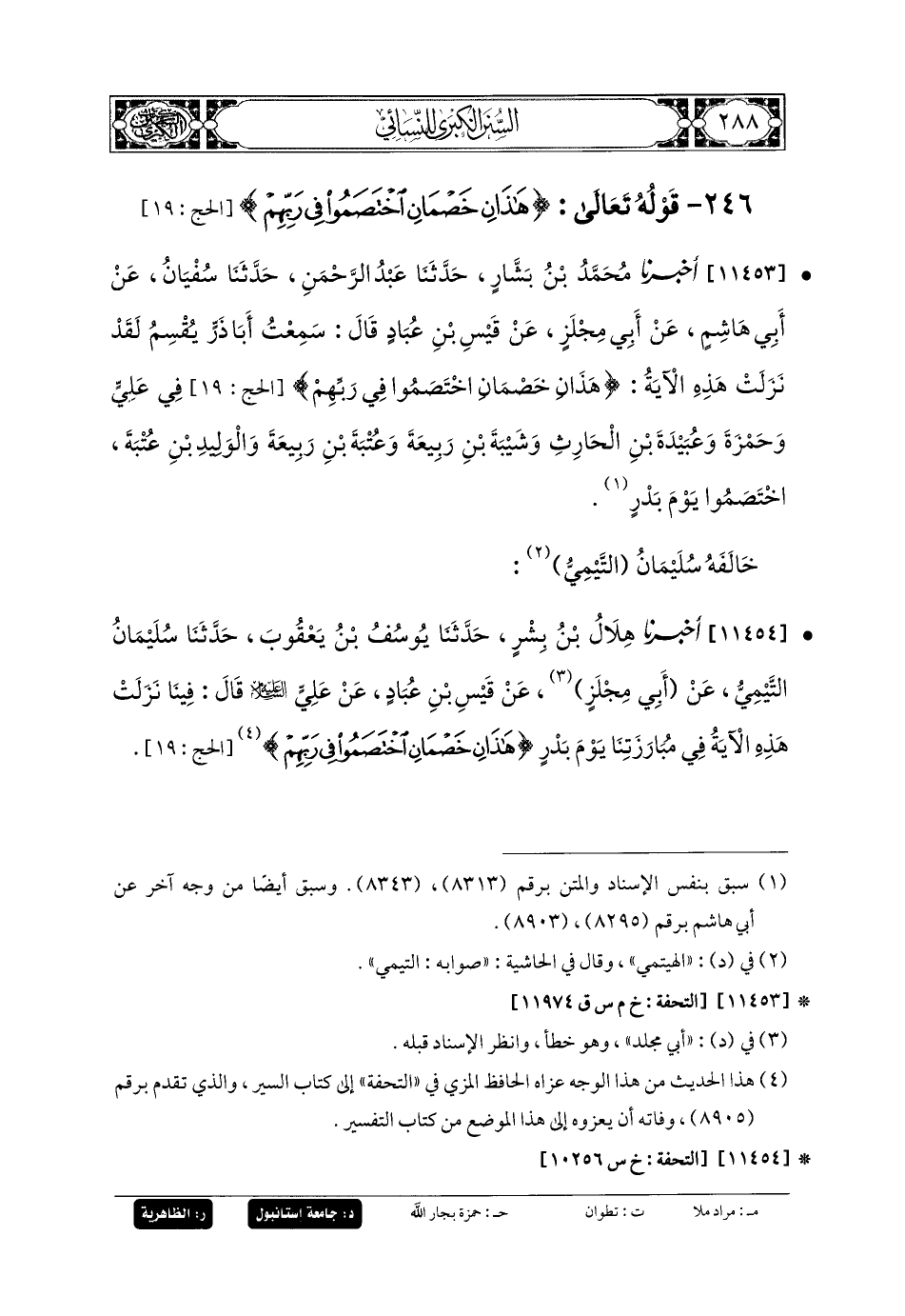 11453- أَخبَرنا مُحَمدُ بنُ بَشَّارٍ، حَدثنا عَبدُ الرَّحمَنِ، حَدثنا سُفيانُ، عَن أَبي هَاشِمٍ، عَن أَبي مِجْلَزٍ، عَن قَيْسِ بنِ عُبَادٍ، قَالَ: سَمِعْتُ أَبَا ذَرٍّ يُقْسِمُ، لَقَدْ نَزَلَتْ هَذِهِ الآيَةُ: {هَذَانِ خَصْمَانِ اخْتَصَمُوا فِي رَبِّهِمْ} فِي عَليٍّ، وَحَمْزَةَ، وَعُبَيدَةَ (1) بنِ الحَارِثِ، وَشَيْبَةَ بنِ رَبِيعَةَ، وَعُتْبَةَ بنِ رَبِيعَةَ، وَالوَلِيدِ بنِ عُتْبَةَ، اخْتَصَمُوا يَوْمَ بَدْرٍ.