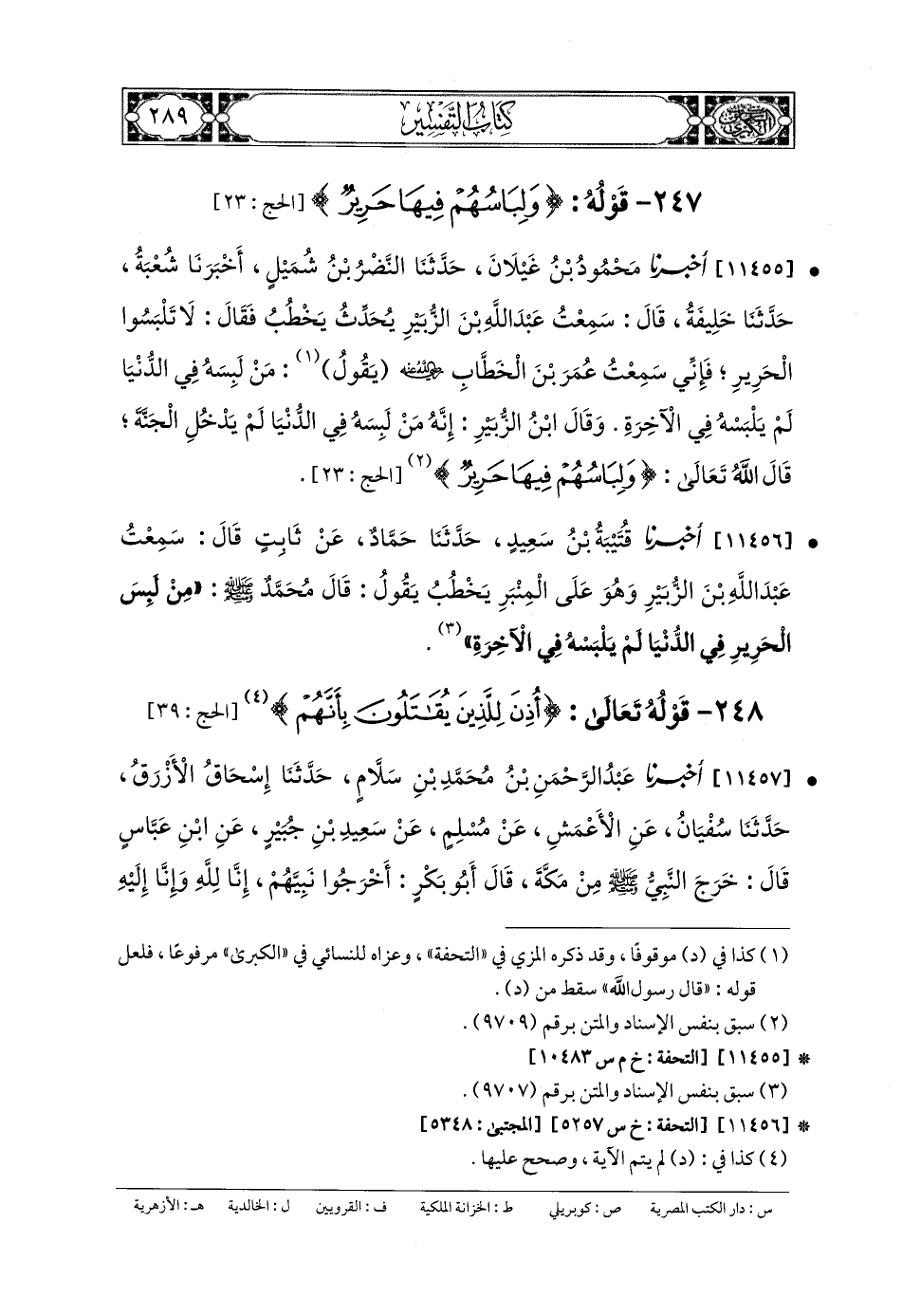 11455- أَخبَرنا مَحْمُودُ بنُ غَيْلانَ، حَدثنا النَّضْرُ بنُ شُمَيْلٍ، أَخبَرنا شُعبَةُ، حَدثنا خَلِيفَةُ، قَالَ: سَمِعْتُ عَبدَ اللهِ بْنَ الزُّبَيْرِ يُحَدِّثُ يَخْطُبُ، فَقَالَ: لا تَلْبَسُوا الحَرِيرَ، فَإِنِّي سَمِعْتُ عُمَرَ بْنَ الخَطَّابِ رضي الله عنه يَقُولُ: قَالَ رَسُولُ اللهِ صَلى الله عَليه وسَلم (1): مَنْ لَبِسَهُ فِي الدُّنْيَا لَمْ يَلْبَسْهُ فِي الآخِرَةِ، وَقَالَ ابنُ الزُّبَيْرِ: إِنَّهُ مَنْ لَبِسَهُ فِي الدُّنْيَا لَمْ يَدْخُلِ الجَنَّةَ، قَالَ اللهُ تَعَالَى: {وَلِبَاسُهُمْ فِيهَا حَرِيرٌ}.