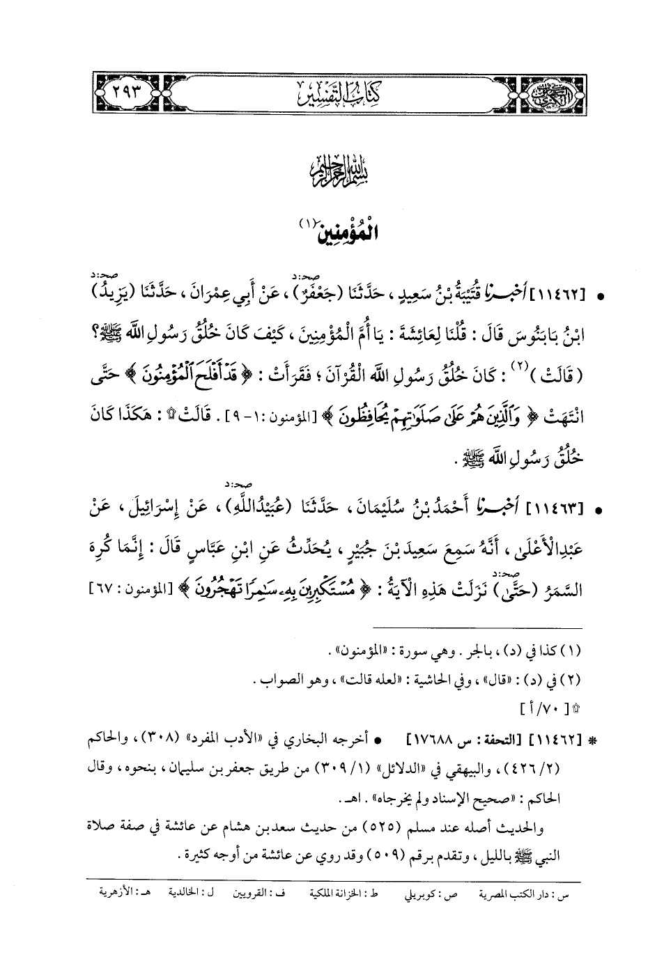 11462- أَخبَرنا قُتَيبَةُ بنُ سَعِيدٍ، حَدثنا جَعفَرٌ، عَن أَبي عِمْرَانَ، حَدثنا يَزِيدُ بنُ بَابَنُوسَ، قَالَ: قُلْنَا لِعَائِشَةَ: يَا أُمَّ المُؤْمِنِينَ، كَيْفَ كَانَ خُلُقُ رَسُولِ اللهِ صَلى الله عَليه وسَلم؟ قَالَتْ: كَانَ خُلُقُ رَسُولِ اللهِ صَلى الله عَليه وسَلم القُرْآنُ، فَقَرَأَتْ: {قَدْ أَفْلَحَ المُؤْمِنُونَ} حَتَّى انْتَهَتْ: {وَالَّذِينَ هُمْ عَلَى صَلَوَاتِهِمْ يُحَافِظُونَ} قَالَتْ: هَكَذَا كَانَ خُلُقُ رَسُولِ اللهِ صَلى الله عَليه وسَلم.