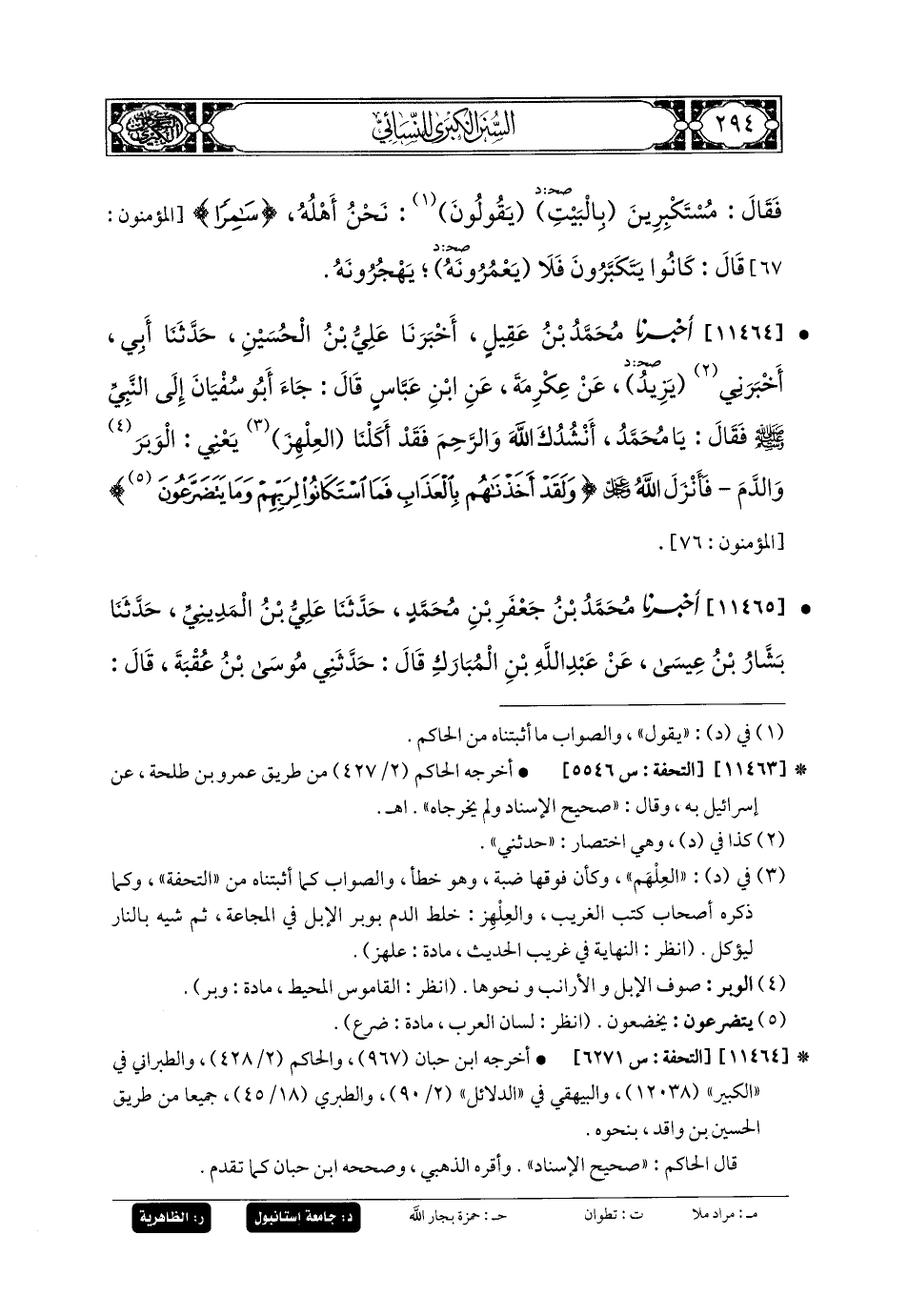 11465- أَخبَرنا مُحَمدُ بنُ جَعفَرِ بنِ مُحَمدٍ، حَدثنا عَليُّ بنُ المَدِينِيِّ، حَدثنا بَشَّارُ بنُ عِيسَى، عَن عَبدِ اللهِ بنِ المُبَارَكِ، قَالَ: حَدَّثني مُوسَى بنُ عُقْبَةَ، قَالَ: سَمِعْتُ عِكْرِمَةَ، عَنِ ابنِ عَبَّاسٍ، فِي قَوْلِهِ: {بِالعَذَابِ إِذَا هُمْ يَجْأَرُونَ لا تَجْأَرُوا اليَوْمَ إِنَّكُمْ مِنَّا لا تُنْصَرُونَ}، قَالَ: هُمْ أَهْلُ بَدْرٍ.
