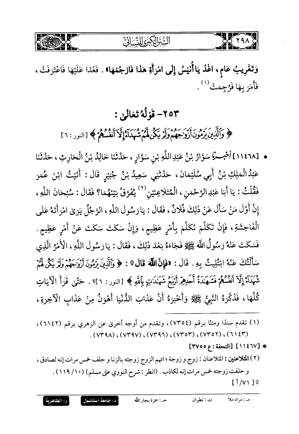 11468- أَخبَرنا سَوَّارُ بنُ عَبدِ اللهِ بنِ سَوَّارٍ، حَدثنا خَالِدُ بنُ الحَارِثِ، حَدثنا عَبدُ المَلِكِ بنُ أَبي سُلَيمَانَ، حَدَّثني سَعِيدُ بنُ جُبَيرٍ، قَالَ: أَتَيْتُ ابنَ عُمَرَ، فَقُلْتُ: يَا أَبَا عَبدِ الرَّحمَنِ، المُتَلاعِنَيْنِ يُفَرَّقُ بَيْنَهُمَا؟ فَقَالَ: سُبْحَانَ اللهِ، إِنَّ أَوَّلَ مَنْ سَأَلَ عَن ذَلِكَ فُلانٌ، فَقَالَ: يَا رَسُولَ اللهِ، الرَّجُلُ يَرَى امْرَأَتَهُ عَلَى الفَاحِشَةِ، فَإِنْ تَكَلَّمَ تَكَلَّمَ بِأَمْرٍ عَظِيمٍ، وَإِنْ سَكَتَ سَكَتَ عَن أَمْرٍ عَظِيمٍ؟ فَسَكَتَ عَنهُ رَسُولُ اللهِ صَلى الله عَليه وسَلم، فَجَاءَهُ بَعْدَ ذَلِكَ، فَقَالَ: يَا رَسُولَ اللهِ، الأَمْرُ الَّذِي سَأَلْتُكَ عَنهُ ابْتُلِيتُ بِهِ؟ قَالَ: فَإِنَّ اللهَ قَالَ: {وَالَّذِينَ يَرْمُونَ أَزْوَاجَهُمْ وَلَمْ يَكُنْ لَهُمْ شُهَدَاءُ إِلاَّ أَنْفُسُهُمْ فَشَهَادَةُ أَحَدِهِمْ أَرْبَعُ شَهَادَاتٍ بِاللَّهِ}، حَتَّى قَرَأَ الآيَاتِ كُلَّهَا، فَذَكَّرَهُ النَّبيُّ صَلى الله عَليه وسَلم، وَأَخبَرَهُ أَنَّ عَذَابَ الدُّنْيَا أَهْوَنُ مِنْ عَذَابِ الآخِرَةِ، فَقَالَ: وَالَّذِي بَعَثَكَ بِالحَقِّ، إِنَّهُ لَلْحَقُّ، ثُمَّ دَعَا المَرْأَةَ فَذَكَّرَهَا اللهَ، وَأَخبَرَهَا أَنَّ عَذَابَ الدُّنْيَا أَهْوَنُ مِنْ عَذَابِ الآخِرَةِ، فَقَالَتْ: وَالَّذِي بَعَثَكَ بِالحَقِّ، مَا كَانَ هَذَا، فَقَالَ لِلرَّجُلِ: تَشْهَدُ {أَرْبَعَ شَهَادَاتٍ بِاللهِ إِنَّهُ لَمِنَ الصَّادِقِينَ وَالخَامِسَةُ أَنَّ لَعْنَةَ اللهِ عَلَيْهِ إِنْ كَانَ مِنَ الكَاذِبِينَ}، ثُمَّ شَهِدَتِ المَرْأَةُ أَرْبَعَ شَهَادَاتٍ بِاللهِ إِنَّهُ لَمِنَ الكَاذِبِينَ، وَالخَامِسَةُ أَنَّ غَضَبَ اللهِ عَلَيْهَا إِنْ كَانَ مِنَ الصَّادِقِينَ، ثُمَّ فَرَّقَ بَيْنَهُمَا.