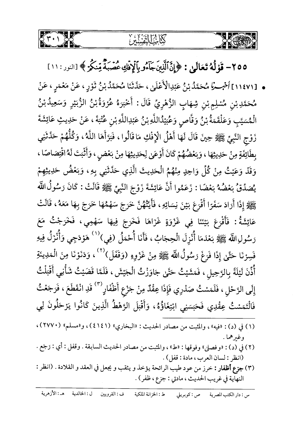 زَعَمُوا أَنَّ عَائِشَةَ زَوْجَ النَّبيِّ صَلى الله عَليه وسَلم قَالَتْ: كَانَ رَسُولُ اللهِ صَلى الله عَليه وسَلم إِذَا أَرَادَ سَفَرًا أَقْرَعَ بَيْنَ نِسَائِهِ، فَأَيَّتُهُنَّ خَرَجَ سَهْمُهَا خَرَجَ بِهَا مَعَهُ، قَالَتْ عَائِشَةُ: فَأَقْرَعَ بَيْنَنَا فِي غَزْوَةٍ غَزَاهَا، فَخَرَجَ فِيهَا سَهْمِي، فَخَرَجْتُ مَعَ رَسُولِ اللهِ صَلى الله عَليه وسَلم بَعْدَ مَا أُنْزِلَ الحِجَابُ، فَأَنَا أُحْمَلُ فِي هَوْدَجِي وَأَنْزِلُ فِيهِ، فَسِرْنَا حَتَّى إِذَا فَرَغَ رَسُولُ اللهِ صَلى الله عَليه وسَلم مِنْ غَزْوهِ وَقَفَلَ وَدَنَوْنَا مِنَ المَدِينَةِ، أُذّنَ لَيْلَةً بِالرَّحِيلِ، فَمَشَيْتُ حَتَّى جَاوَزْتُ الجَيْشَ، فَلَمَّا قَضَيْتُ شَأْنِي أَقْبَلْتُ إِلَى الرَّحْلِ، فَلَمَسْتُ صَدْرِي فَإِذَا عِقْدٌ مِنْ جَزْعِ أَظْفَارٍ قَدِ انْقَطَعَ، فَرَجَعْتُ فَالتَمَسْتُ عِقْدِي، فَحَبَسَنِي ابْتِغَاؤُهُ، وَأَقْبَلَ الرَّهْطُ الَّذِينَ كَانُوا يَرْحَلُونَ لِي، وَحَمَلُوهُ عَلَى بَعِيرِي الَّذِي كُنْتُ أَرْكَبُهُ، وَهُمْ يَحْسِبُونَ أَنِّي فِيهِ، وَكَانَ النِّسَاءُ إِذْ ذَاكَ خِفَافًا لَمْ يُهَبّلْنَّ وَلَمْ يَغْشَهُنَّ اللَّحْمُ، إِنَّمَا يَأْكُلْنَ العُلْقَتَيْنِ مِنَ الطَّعَامِ، فَلَمْ يَسْتَنْكِرِ القَوْمُ ثِقَلَ الهَوْدَجِ حِينَ رَفَعُوهُ وَرَحَلُوهُ، وَكُنْتُ جَارِيَةً حَدِيثَةَ السِّنِّ، فَبَعَثُوا الجَمَلَ وَسَارُوا، فَوَجَدْتُ عِقْدِي بَعْدَ مَا اسْتَمَرَّ الجَيْشُ، فَجِئْتُ مَنَازِلَهُمْ وَلَيْسَ بِهَا دَاعٍ وَلا مُجِيبٌ، فَيَمَّمْتُ مَنْزِلِي الَّذِي كُنْتُ فِيهِ، وَظَنَنْتُ أَنَّ القَوْمَ سَيَفْقِدُونِي فَيَرْجِعُونَ، فَبَيْنَا أَنَا جَالِسَةٌ فِيُ مَنْزِلِي، إِذْ غَلَبَتْنِي عَيْنِي فَنِمْتُ حَتَّى أَصْبَحْتُ، وَكَانَ صَفْوَانُ بنُ المُعَطَّلِ مِنْ وَرَاءِ الجَيْشِ، فَادْلَجَ، فَأَصْبَحَ عِنْدَ مَنْزِلِي، فَرَأَى سَوَادَ إِنْسَانٍ نَائِمًا، فَأَتَانِي فَعَرَفَنِي حِينَ رَآنِي، وَكَانَ يَرَانِي قَبْلَ أَنْ يُضْرَبَ عَلَيْنَا الحِجَابُ،