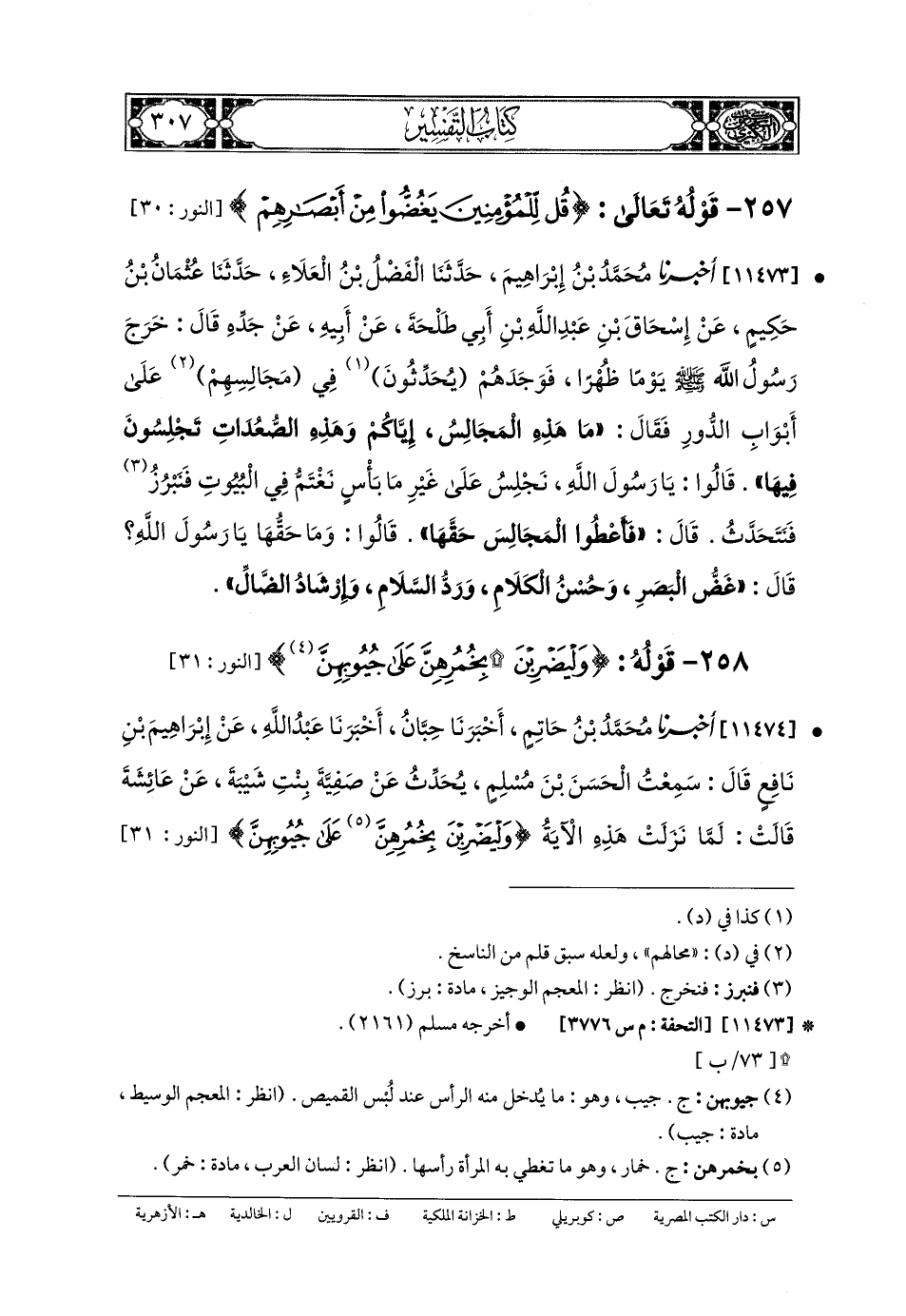 11474- أَخبَرنا مُحَمدُ بنُ حَاتِمٍ، أَخبَرنا حِبَّانُ، أَخبَرنا عَبدُ اللهِ، عَن إِبرَاهِيمَ بنِ نَافِعٍ، قَالَ: سَمِعْتُ الحَسَنَ بْنَ مُسْلِمٍ يُحَدِّثُ عَن صَفِيَّةَ بِنْتِ شَيْبَةَ، عَن عَائِشَةَ، قَالَتْ: لَمَّا نَزَلَتْ هَذِهِ الآيَةُ: {وَلْيَضْرِبْنَ بِخُمُرِهِنَّ عَلَى جُيُوبِهِنَّ} قَالَتْ: أَخَذْنَ النِّسَاءُ أُزُرَهُنَّ فَشَقَقْنَهَا مِنْ نَحْوِ الحَوَاشِي فَاخْتَمَرْنَ بِهَا.