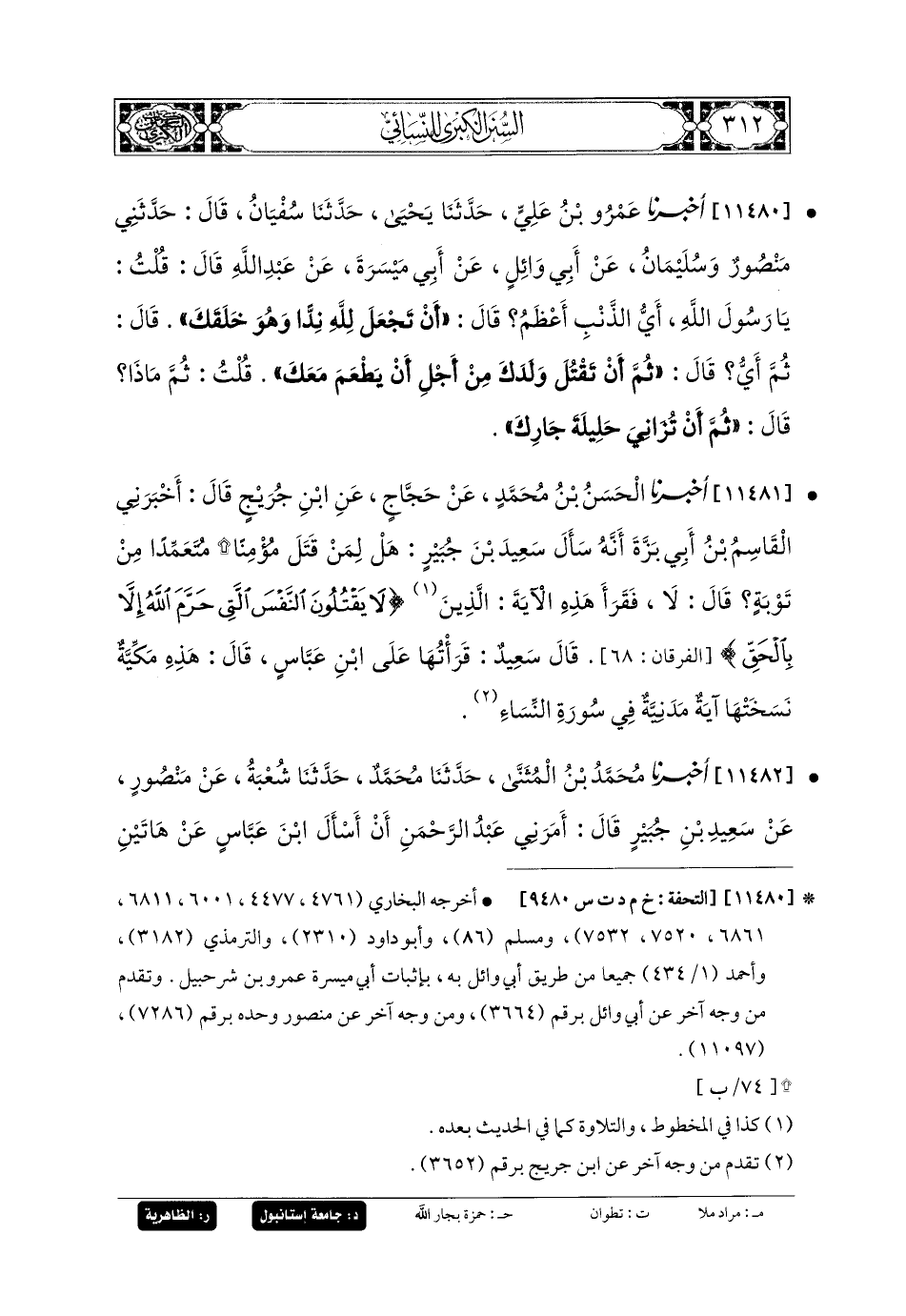 11482- أَخبَرنا مُحَمدُ بنُ المُثَنَّى، حَدثنا مُحَمدٌ، حَدثنا شُعبَةُ، عَن مَنصُورٍ، عَن سَعِيدِ بنِ جُبَيرٍ، قَالَ: أَمَرَنِي عَبدُ الرَّحمَنِ أَنْ أَسْأَلَ ابنَ عَبَّاسٍ عَن هَاتَيْنِ الآيَتَيْنِ: {وَمَنْ يَقْتُلْ مُؤْمِنًا مُتَعَمِّدًا فَجَزَاؤُهُ جَهَنَّمُ}، فَقَالَ: لَمْ يَنْسَخْهَا شَيْءٌ، وَعَن هَذِهِ الآيَةِ: {وَالَّذِينَ لا يَدْعُونَ مَعَ اللهِ إِلَهًا آخَرَ وَلا يَقْتُلُونَ النَّفْسَ الَّتِي حَرَّمَ اللهُ إِلاَّ بِالحَقِّ}، قَالَ: نَزَلَتْ فِي أَهْلِ الشِّرْكِ.