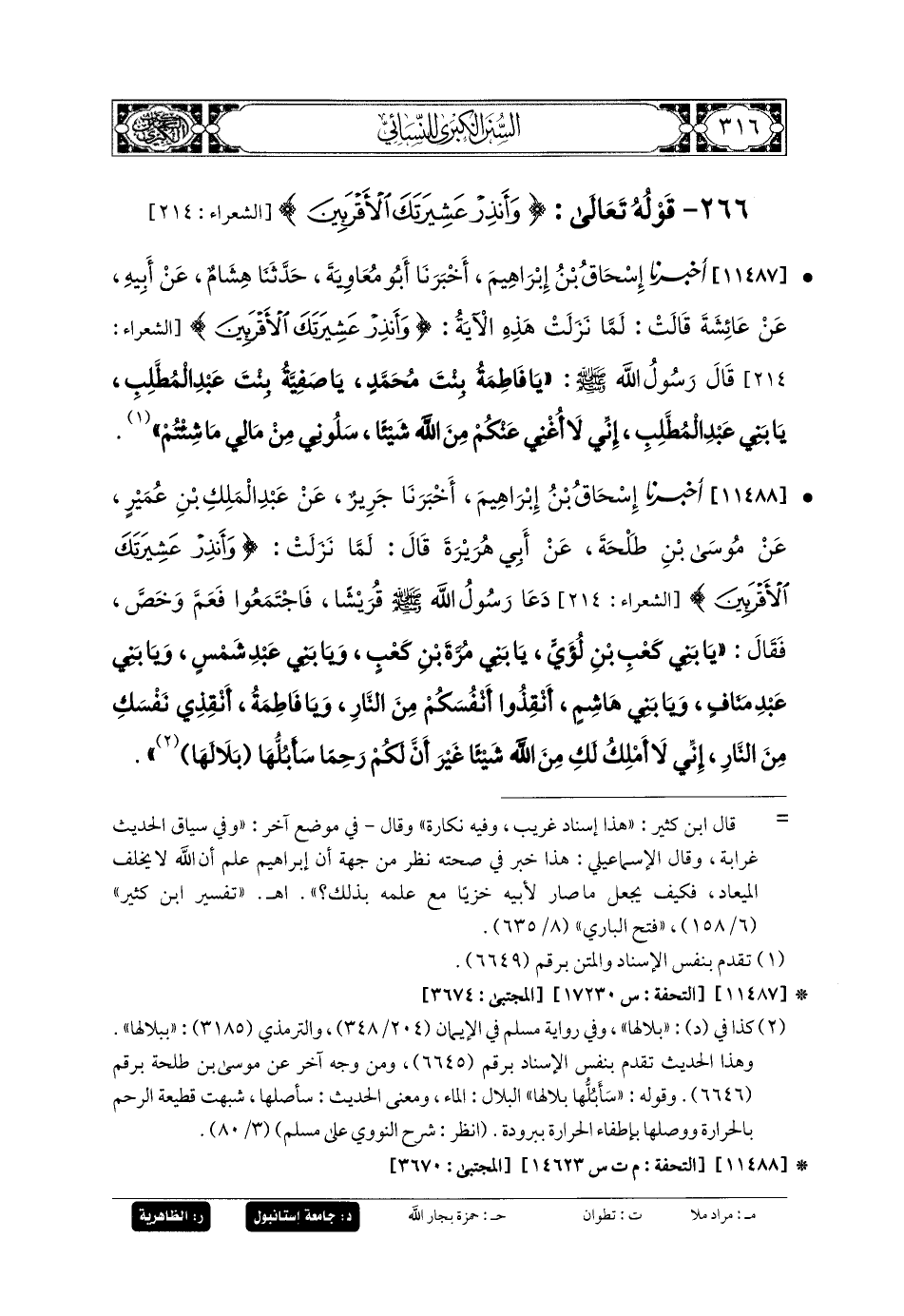 11488- أَخبَرنا إِسحَاقُ بنُ إِبرَاهِيمَ، أَخبَرنا جَرِيرٌ، عَن عَبدِ المَلِكِ بنِ عُمَيْرٍ، عَن مُوسَى بنِ طَلحَةَ، عَن أَبي هُرَيرَةَ، قَالَ: لَمَّا نَزَلَتْ: {وَأَنْذِرْ عَشِيرَتَكَ الأَقْرَبِينَ}، دَعَا رَسُولُ اللهِ صَلى الله عَليه وسَلم قُرَيْشًا فَاجْتَمَعُوا، فَعَمَّ وَخَصَّ، فَقَالَ: يَا بَنِي كَعْبِ بنِ لُؤَيٍّ، يَا بَنِي مُرَّةَ بنِ كَعْبٍ، وَيَا بَنِي عَبدِ شَمْسٍ، وَيَا بَنِي عَبدِ مَنَافٍ، وَيَا بَنِي هَاشِمٍ، أَنْقِذُوا أَنْفُسَكُمْ مِنَ النَّارِ، وَيَا فَاطِمَةُ أَنْقِذِي نَفْسَكِ مِنَ النَّارِ، إِنِّي لا أَمْلِكُ لَكِ مِنَ اللهِ شَيْئًا، غَيْرَ أَنَّ لَكُمْ رَحِمًا سَأَبُلُّهَا بلالِهَا.