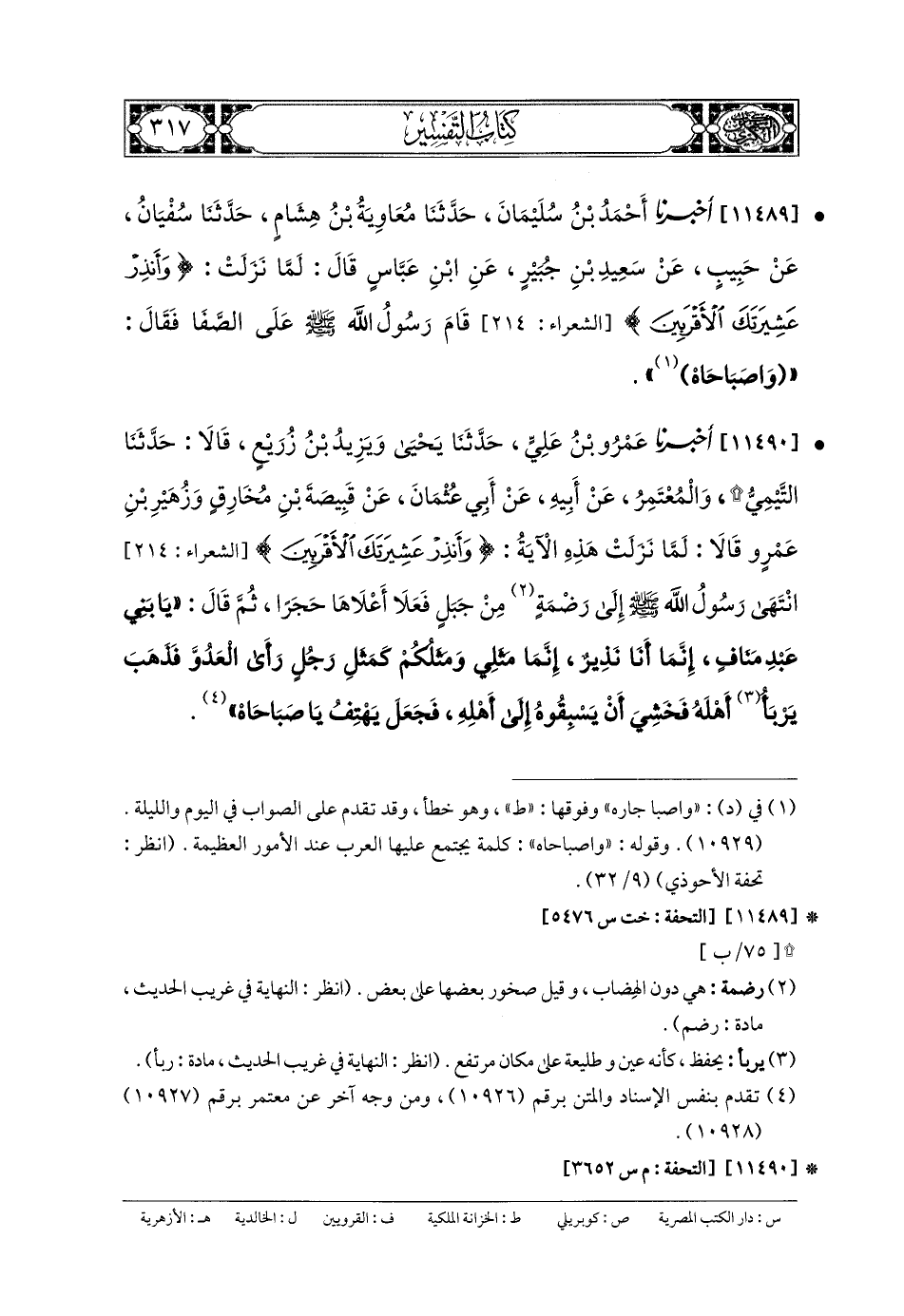 11489- أَخبَرنا أَحْمَدُ بنُ سُلَيمَانَ، حَدثنا مُعاويَةُ بنُ هِشَامٍ، حَدثنا سُفيانُ، عَن حَبِيبٍ، عَن سَعِيدِ بنِ جُبَيرٍ، عَنِ ابنِ عَبَّاسٍ، قَالَ: لَمَّا نَزَلَتْ: {وَأَنْذِرْ عَشِيرَتَكَ الأَقْرَبِينَ} قَامَ رَسُولُ اللهِ صَلى الله عَليه وسَلم عَلَى الصَّفَا فَقَالَ: وَاصَبَاحَاهُ.