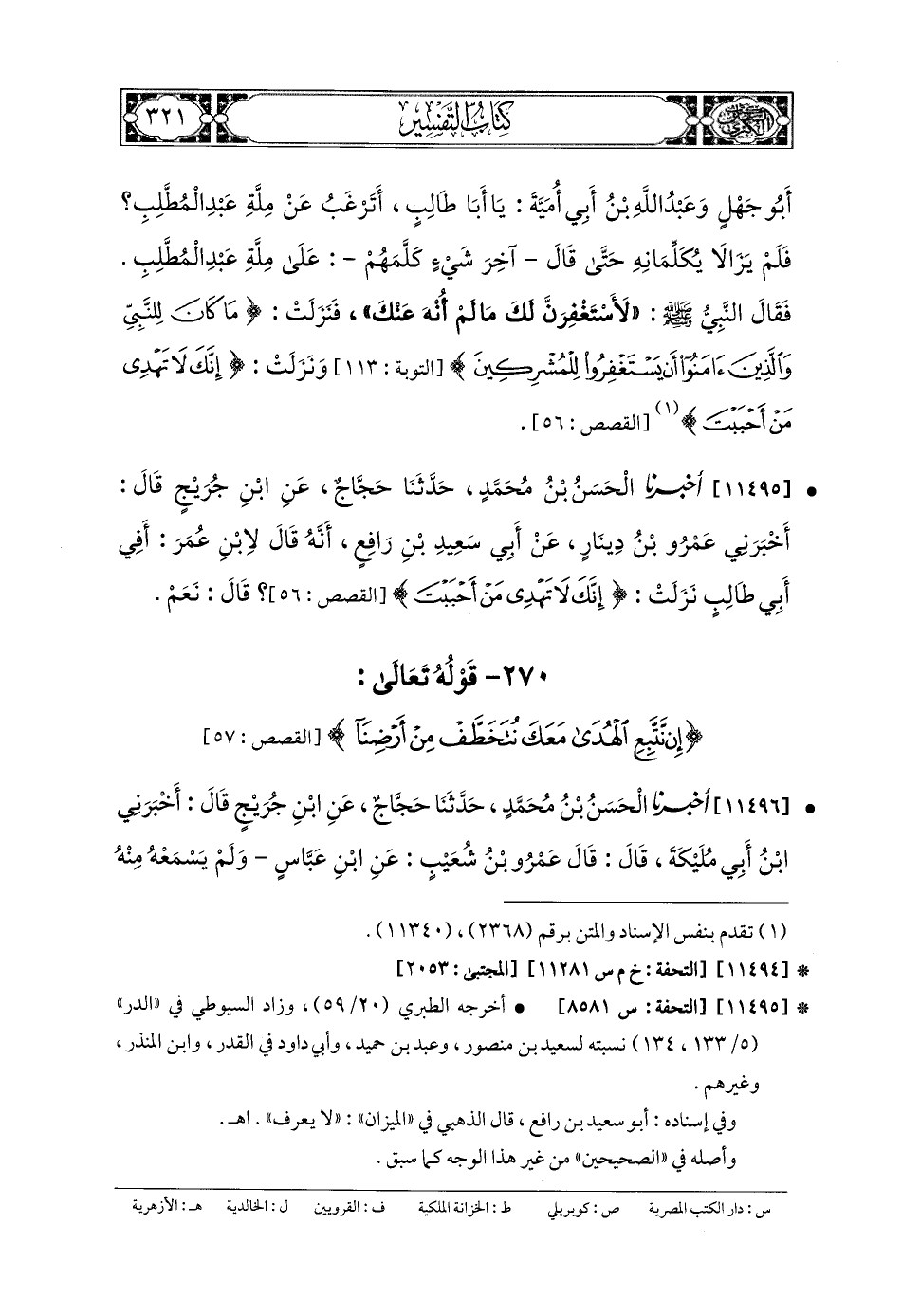 11496- أَخبَرنا الحَسَنُ بنُ مُحَمدٍ، حَدثنا حَجَّاجٌ، عَنِ ابنِ جُرَيْجٍ، قَالَ: أَخبَرني ابنُ أَبي مُلَيْكَةَ، قَالَ: قَالَ عَمرُو بنُ شُعَيبٍ، عَنِ ابنِ عَبَّاسٍ، وَلَمْ يَسْمَعْهُ مِنْهُ، أَنَّ الحَارِثَ بْنَ عَامِرِ بنِ نَوْفَلٍ الَّذِي قَالَ: {إِنْ نَتَّبِعَ الهُدَى مَعَكَ نُتَخَطَّفْ مِنْ أَرْضِنَا}.