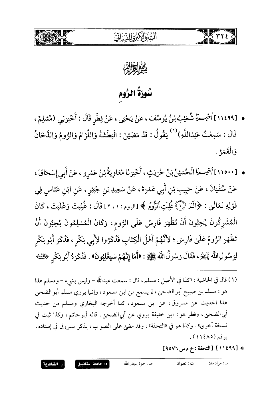 11500 - أَخبَرنا الحُسَيْنُ بنُ حُرَيْثٍ، أَخبَرنا مُعاويَةُ بنُ عَمْرٍو، عَن أَبي إِسحَاقَ، عَن سُفيانَ، عَن حَبِيبِ بنِ أَبي عَمْرَةَ، عَن سَعِيدِ بنِ جُبَيرٍ، عَنِ ابنِ عَبَّاسٍ، فِي قَوْلِهِ تَعَالَى: {الم غُلِبَتِ الرُّومُ} قَالَ: غَلَبَتْ، وَغُلِبَتْ، كَانَ المُشْرِكُونَ يُحِبُّونَ أَنْ تَظْهَرَ فَارِسُ عَلَى الرُّومِ، وَكَانَ المُسْلِمُونَ يُحِبُّونَ أَنْ تَظْهَرَ الرُّومُ عَلَى فَارِسَ، لأَنَّهُمْ أَهْلُ كِتَابٍ، فَذَكَرُوا لأَبي بَكْرٍ، فَذَكَرَ أَبو بَكْرٍ لِرَسُولِ اللهِ صَلى الله عَليه وسَلم، فَقَالَ رَسُولُ اللهِ صَلى الله عَليه وسَلم: أَمَا إِنَّهُمْ سَيَغْلِبُونَ، فَذَكَرَهُ أَبو بَكْرٍ رَضِيَ اللهُ عَنهُ، فَقَالُوا: اجْعَلْ بَيْنَنَا وَبَيْنَكَ أَجَلاً، فَإِنْ ظَهَرْت كان لنَا كَذَا وَكَذَا، وَإِنْ ظَهَرْتُمْ كَانَ لَكُمْ كَذَا وَكَذَا، فَجَعَلَ أَجْلَ خَمْسِ سِنِينَ.