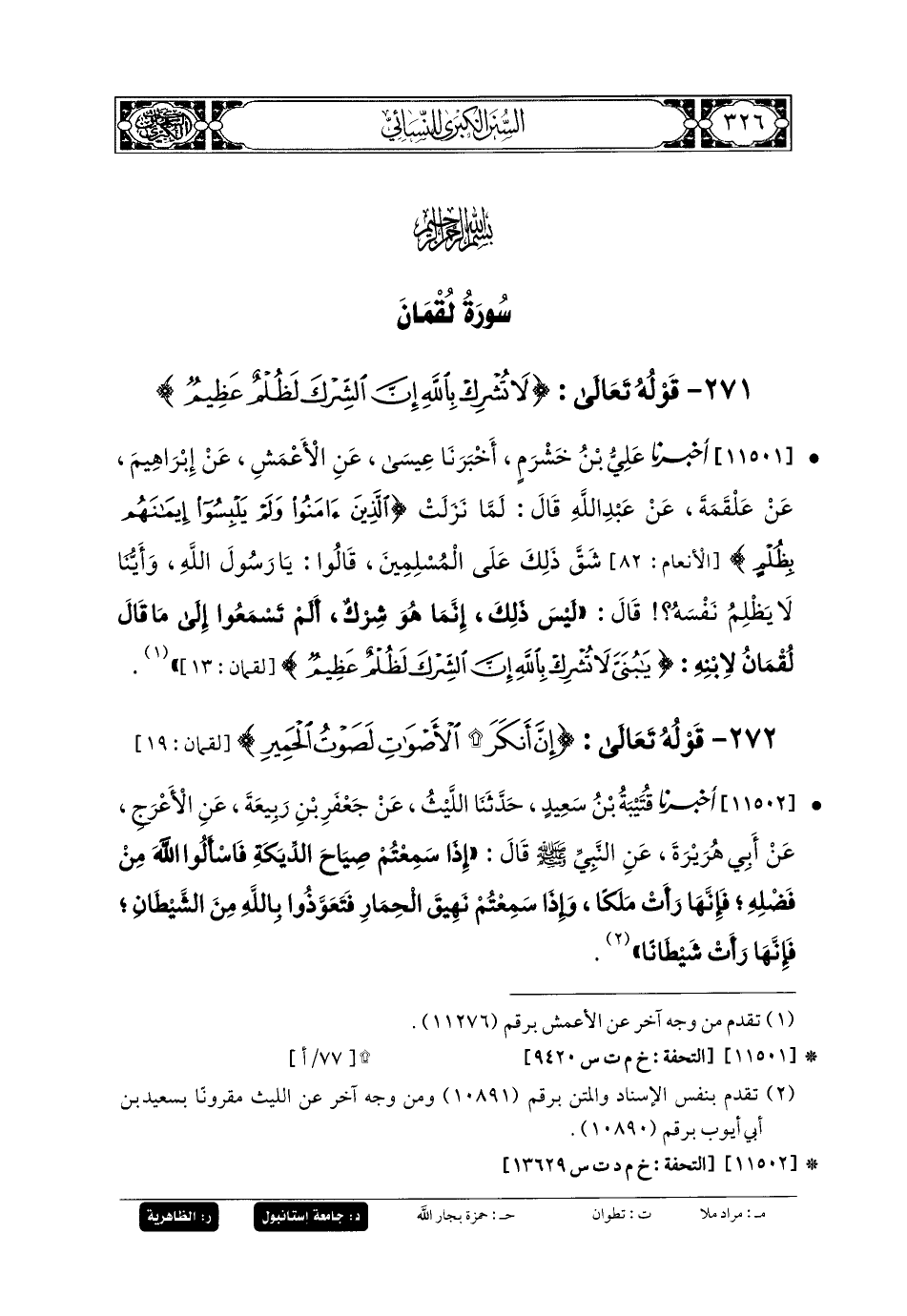 11501- أَخبَرنا عَليُّ بنُ خَشْرَمٍ، أَخبَرنا عِيسَى، عَنِ الأَعْمَشِ، عَن إِبرَاهِيمَ، عَن عَلْقَمَةَ، عَن عَبدِ اللهِ، قَالَ: لَمَّا نَزَلَتِ: {الَّذِينَ آمَنُوا وَلَمْ يَلْبِسُوا إِيمَانَهُمْ بِظُلْمٍ}، شَقَّ ذَلِكَ عَلَى المُسْلِمِينَ، قَالُوا: يَا رَسُولَ اللهِ، وَأَيُّنَا لا يَظْلِمُ نَفْسَهُ؟ قَالَ: لَيْسَ ذَلِكَ، إِنَّمَا هُوَ الشِّرْكُ، أَلَمْ تَسْمَعُوا إِلَى مَا قَالَ لُقْمَانُ لاِبْنِهِ: {يَا بُنَيَّ لا تُشْرِكْ بِاللهِ إِنَّ الشِّرْكَ لَظُلْمٌ عَظِيمٌ}.