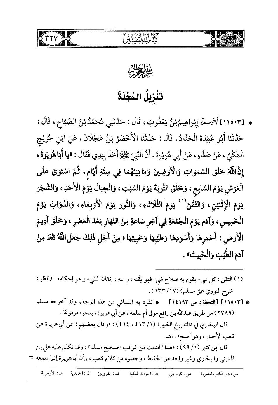 11503- أَخبَرنا إِبرَاهِيمُ بنُ يَعقُوبَ، قَالَ: حَدَّثني مُحَمدُ بنُ الصَّبَّاحِ، قَالَ: حَدثنا أَبو عُبَيدَةَ الحَدَّادُ، قَالَ: حَدثنا الأَخْضَرُ بنُ عَجْلانَ، عَنِ ابنِ جُرَيْجِ المَكِّيِّ، عَن عَطَاءٍ، عَن أَبي هُرَيرَةَ، أَنَّ النَّبيَّ صَلى الله عَليه وسَلم أَخَذَ بِيَدِي، فَقَالَ: يَا أَبَا هُرَيرَةَ، إِنَّ اللهَ خَلَقَ السَّمَاوَاتِ وَالأَرَضِينَ وَمَا بَيْنَهُمَا فِي سِتَّةِ أَيَّامٍ، ثُمَّ اسْتَوَى عَلَى العَرْشِ يَوْمَ السَّابِعِ، وَخَلَقَ التُّرْبَةَ يَوْمَ السَّبْتِ، وَالجِبَالَ يَوْمَ الأَحَدِ، وَالشَّجَرَ يَوْمَ الاِثْنَيْنِ، وَالتِّقْنَ يَوْمَ الثُّلاثَاءِ، وَالنُّورَ يَوْمَ الأَرْبِعَاءِ، وَالدَّوَابَّ يَوْمَ الخَمِيسِ، وَآدَمَ يَوْمَ الجُمُعَةِ فِي آخِرِ سَاعَةٍ مِنَ النَّهَارِ بَعْدَ العَصْرِ، وَخَلَقَ أَدِيمَ الأَرْضِ أَحْمَرَهَا وَأَسْوَدَهَا، وَطَيِّبَهَا وَخَبِيثَهَا، مِنْ أَجْلِ ذَلِكَ جَعَلَ اللهُ عَزَّ وَجَلَّ مِنْ آدَمَ الطَّيِّبَ وَالخَبِيثَ.