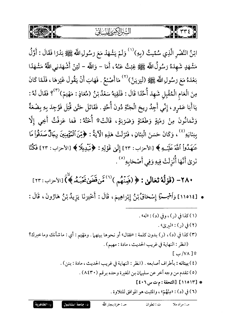 11514- أَخبَرنا إِسحَاقُ بنُ إِبرَاهِيمَ، قَالَ: أَخبَرنا يَزِيدُ بنُ هَارُونَ، قَالَ: أَخبَرنا حُمَيْدٌ، عَن أَنَسٍ، أَنَّ عَمَّهُ غَابَ عَن قِتَالِ أَهْلِ بَدْرٍ، فَلَمَّا كَانَ يَوْمُ أُحُدٍ وَانْكَشَفَ المُسْلِمُونَ، قَالَ: اللهُمَّ إِنِّي أَعْتَذِرُ إِلَيْكَ مِمَّا صَنَعَ هَؤُلاءِ، يَعْنِي أَصْحَابَهُ، وَأَبْرَأُ إِلَيْكَ مِمَّا جَاءَ بِهِ هَؤُلاءِ، يَعْنِي المُشْرِكِينَ، فَلَقِيَهُ سَعْدٌ دُونَ أُحُدٍ، قَالَ سَعْدٌ: فَلَمْ أَسْتَطِعْ أَنْ أَفْعَلَ فِعْلَهُ، قَالَ: فَوُجِدَ فِيهِ ثَمَانُونَ طَعْنَةً، مِنْ بَيْنِ طَعْنَةٍ بِرُمْحٍ، وَضَرْبَةٍ بِسَيْفٍ، وَرَمْيَةٍ بِسَهْمٍ، قَالَ: فَكُنَّا نَقُولُ فِيهِ وَفِي أَصْحَابِهِ: {فَمِنْهُمْ مَنْ قَضَى نَحْبَهُ وَمِنْهُمْ مَنْ يَنْتَظِرُ وَمَا بَدَّلُوا تَبْدِيلاً}.