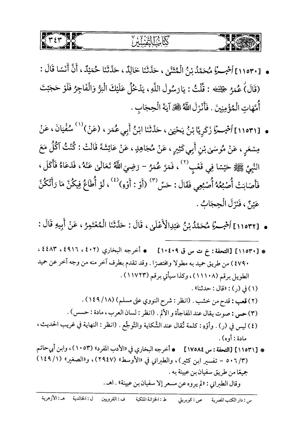 11530- أَخبَرنا مُحَمدُ بنُ المُثَنَّى، حَدثنا خَالِدٌ، حَدثنا حُمَيْدٌ، أَنَّ أَنَسًا قَالَ: قَالَ عُمَرُ رضي الله عنه: قُلْتُ: يَا رَسُولَ اللهِ، يَدْخُلُ عَلَيْكَ البَرُّ وَالفَاجِرُ، فَلَوْ حَجَبْتَ أُمَّهَاتِ المُؤْمِنِينَ، فَأَنْزَلَ اللهُ عَزَّ وَجَلَّ آيَةَ الحِجَابِ.