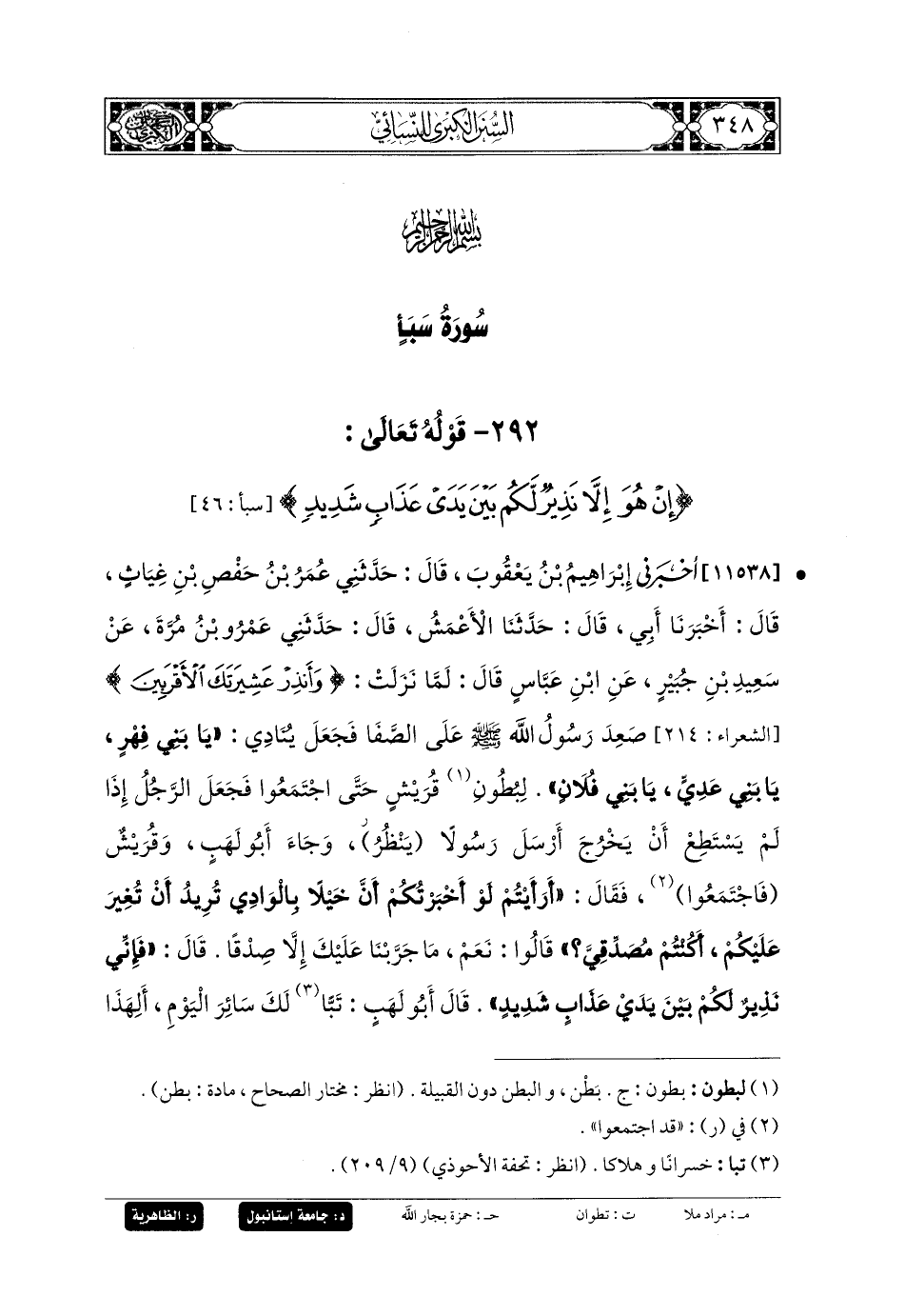 11538- أَخبَرني إِبرَاهِيمُ بنُ يَعقُوبَ، قَالَ: حَدَّثني عُمَرُ بنُ حَفْصِ بنِ غِيَاثٍ، قَالَ: أخبرنا أَبي، قَالَ: حَدثنا الأَعْمَشُ، قَالَ: حَدَّثني عَمرُو بنُ مُرَّةَ، عَن سَعِيدِ بنِ جُبَيرٍ، عَنِ ابنِ عَبَّاسٍ، قَالَ: لَمَّا نَزَلَتْ: {وَأَنْذِرْ عَشِيرَتَكَ الأَقْرَبِينَ} صَعِدَ رَسُولُ اللهِ صَلى الله عَليه وسَلم عَلَى الصَّفَا، فَجَعَلَ يُنَادِي: يَا بَنِي فِهْرٍ، يَا بَنِي عَدِيٍّ، يَا بَنِي فُلانٍ، لِبُطُونِ قُرَيْشٍ، حَتَّى اجْتَمَعُوا، فَجَعَلَ الرَّجُلُ إِذَا لَمْ يَسْتَطِعْ أَنْ يَخْرُجَ أَرْسَلَ رَسُولاً يَنْظُرُ، وَجَاءَ أَبو لَهَبٍ، وَقُرَيْشٌ فاجْتَمَعُوا، فَقَالَ: أَرَأَيْتُمْ لَوْ أَخبَرْتُكُمْ أَنَّ خَيْلاً بِالوَادِي تُرِيدُ أَنْ تُغِيرَ عَلَيْكُمْ أَكُنْتُمْ مُصَدِّقِيَّ؟ قَالُوا: نَعَمْ، مَا جَرَّبْنَا عَلَيْكَ إِلاَّ صِدْقًا، قَالَ: فَإِنِّي نَذِيرٌ لَكُمْ بَيْنَ يَدَيْ عَذَابٍ شَدِيدٍ، قَالَ أَبو لَهَبٍ: تَبًّا لَكَ سَائِرَ اليَوْمِ، أَلِهَذَا جَمَعْتَنَا؟ فَنَزَلَتْ: {تَبَّتْ يَدَا أَبي لَهَبٍ}.