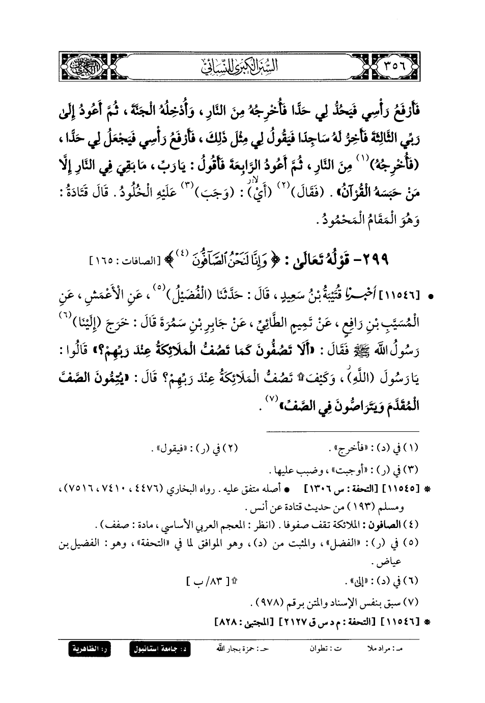 11546- أَخبَرنا قُتَيبَةُ بنُ سَعِيدٍ، قَالَ: حَدثنا الفُضَيْلُ، عَنِ الأَعْمَشِ، عَنِ المُسَيَّبِ بنِ رَافِعٍ، عَن تَمِيمٍ الطَّائِيِّ، عَن جَابِرِ بنِ سَمُرَةَ، قَالَ: خَرَجَ إِلَيْنَا رَسُولُ اللهِ صَلى الله عَليه وسَلم فَقَالَ: أَلا تَصُفُّونَ كَمَا تَصُفُّ المَلائِكَةُ عِنْدَ رَبِّهِمْ؟ قَالُوا: يَا رَسُولَ اللهِ، وَكَيْفَ تَصُفُّ المَلائِكَةُ عِنْدَ رَبِّهِمْ؟ قَالَ: يُتِمُّونَ الصَّفَّ المُقَدَّمَ، وَيَتَرَاصُّونَ فِي الصَّفِّ.