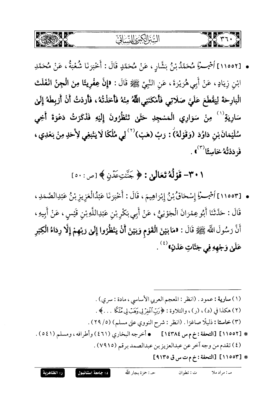 11552- أَخبَرنا مُحَمدُ بنُ بَشَّارٍ، عَن مُحَمدٍ، قَالَ: أَخبَرنا شُعبَةُ، عَن مُحَمدِ بنِ زِيَادٍ، عَن أَبي هُرَيرَةَ، عَنِ النَّبيِّ صَلى الله عَليه وسَلم قَالَ: إِنَّ عِفْرِيتًا مِنَ الجِنِّ انْفَلَتَ البَارِحَةَ لِيَقْطَعَ عَلَيَّ صَلاتِي، فَأَمْكَنَنِي اللهُ مِنْهُ، فَأَخَذْتُهُ فَأَرَدْتُ أَنْ أَرْبِطَهُ إِلَى سَارِيَةٍ مِنْ سَوَارِي المَسْجِدِ حَتَّى تَنْظُرُونَ إِلَيْهِ، فَذَكَرْتُ دَعْوَةَ أَخِي سُلَيمَانَ بنِ دَاوُدَ، وَقَوْلَهُ: {رَبِّ اغْفِرْ لِي وَهَبْ لِي مُلْكًا لا يَنْبَغِي لأَحَدٍ مِنْ بَعْدِي}، فَرَدَدْتُهُ خَاسِئًا.