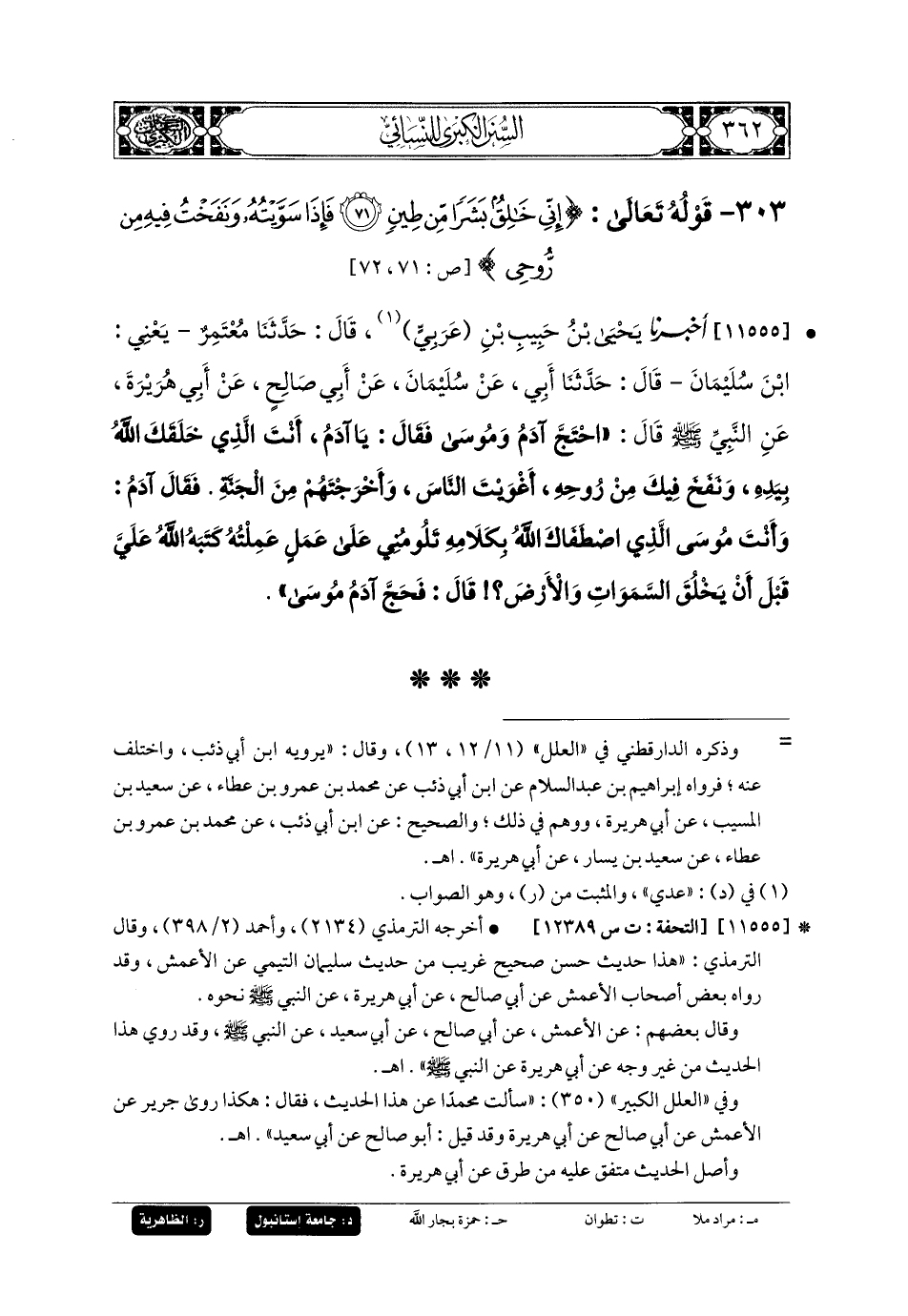 11555- أَخبَرنا يَحيَى بنُ حَبِيبِ بنِ عَرَبِيٍّ، قَالَ: حَدثنا مُعْتَمِرٌ، يَعْنِي ابنَ سُلَيمَانَ، قَالَ: حَدثنا أَبي، عَن سُلَيمَانَ، عَن أَبي صَالِحٍ، عَن أَبي هُرَيرَةَ، عَنِ النَّبيِّ صَلى الله عَليه وسَلم قَالَ: احْتَجَّ آدَمُ وَمُوسَى، فَقَالَ: يَا آدَمُ، أَنْتَ الَّذِي خَلَقَكَ اللهُ بِيَدِهِ، وَنَفَخَ فِيكَ مِنْ رُوحِهِ، أَغْوَيْتَ النَّاسَ، وَأَخْرَجْتَهُمْ مِنَ الجَنَّةِ، فَقَالَ آدَمُ: وَأَنْتَ مُوسَى الَّذِي اصْطَفَاكَ اللهُ بِكَلامِهِ، تَلُومُنِي عَلَى عَمَلٍ عَمِلْتُهُ كَتَبَهُ اللهُ عَلَيَّ قَبْلَ أَنْ يَخْلُقَ السَّمَاوَاتِ وَالأَرْضَ؟ قَالَ: فَحَجَّ آدَمُ مُوسَى.