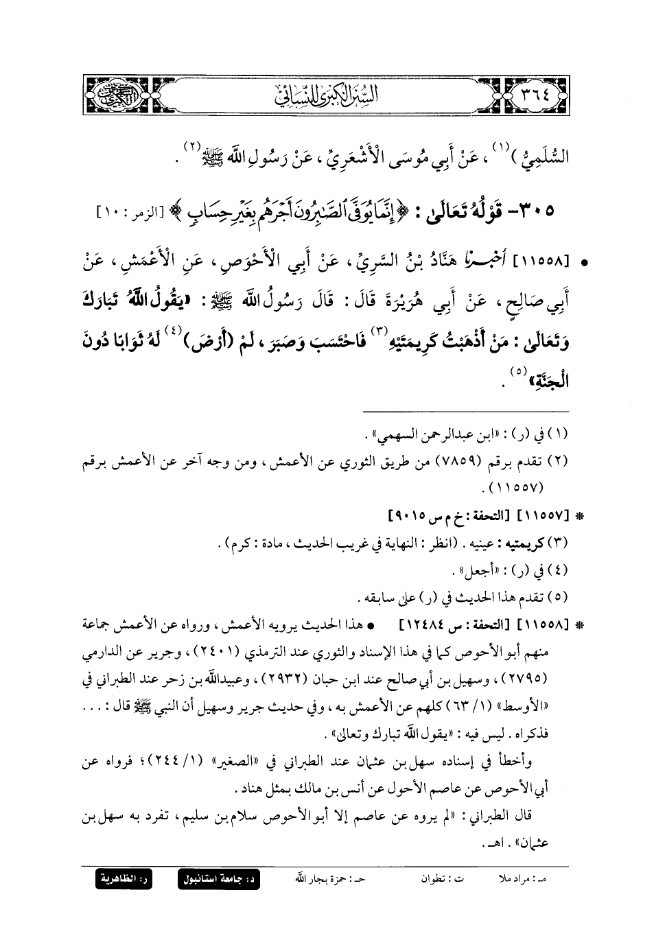 11558- أَخبَرنا هَنَّادُ بنُ السَّرِيِّ، عَن أَبي الأَحْوَصِ، عَنِ الأَعْمَشِ، عَن أَبي صَالِحٍ، عَن أَبي هُرَيرَةَ، قَالَ: قَالَ رَسُولُ اللهِ صَلى الله عَليه وسَلم: يَقُولُ اللهُ تَبَارَكَ وَتَعَالَى: مَنْ أَذْهَبْتُ كَرِيمَتَيْهِ، فَاحْتَسَبَ وَصَبَرَ لَمْ أَرض لَهُ ثَوَابًا دُونَ الجَنَّةِ.