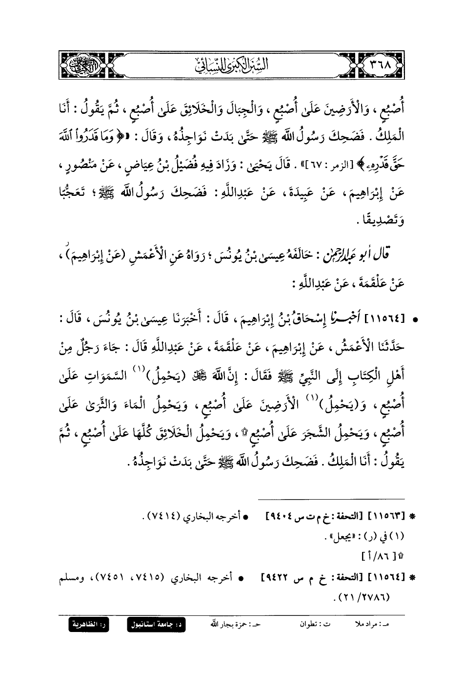 11564 - أَخبَرنا إِسحَاقُ بنُ إِبرَاهِيمَ، قَالَ: أَخبَرنا عِيسَى بنُ يُونُسَ، قَالَ: حَدثنا الأَعْمَشُ، عَن إِبرَاهِيمَ، عَن عَلْقَمَةَ، عَن عَبدِ اللهِ، قَالَ: جَاءَ رَجُلٌ مِنْ أَهْلِ الكِتَابِ إِلَى النَّبيِّ صَلى الله عَليه وسَلم، فَقَالَ: إِنَّ اللهَ يَحْمِلُ السَّمَاوَاتِ عَلَى إِصْبُعٍ، وَيَحْمِلُ الأَرَضِينَ عَلَى إِصْبُعٍ، وَيَحْمِلُ المَاءَ وَالثَّرَى عَلَى إِصْبُعٍ، وَيَحْمِلُ الشَّجَرَ عَلَى إِصْبُعٍ، وَيَحْمِلُ الخَلائِقَ كُلَّهَا عَلَى إِصْبُعٍ، ثُمَّ يَقُولُ: أَنَا المَلِكُ، فَضَحِكَ رَسُولُ اللهِ صَلى الله عَليه وسَلم حَتَّى بَدَتْ نَوَاجِذُهُ.
