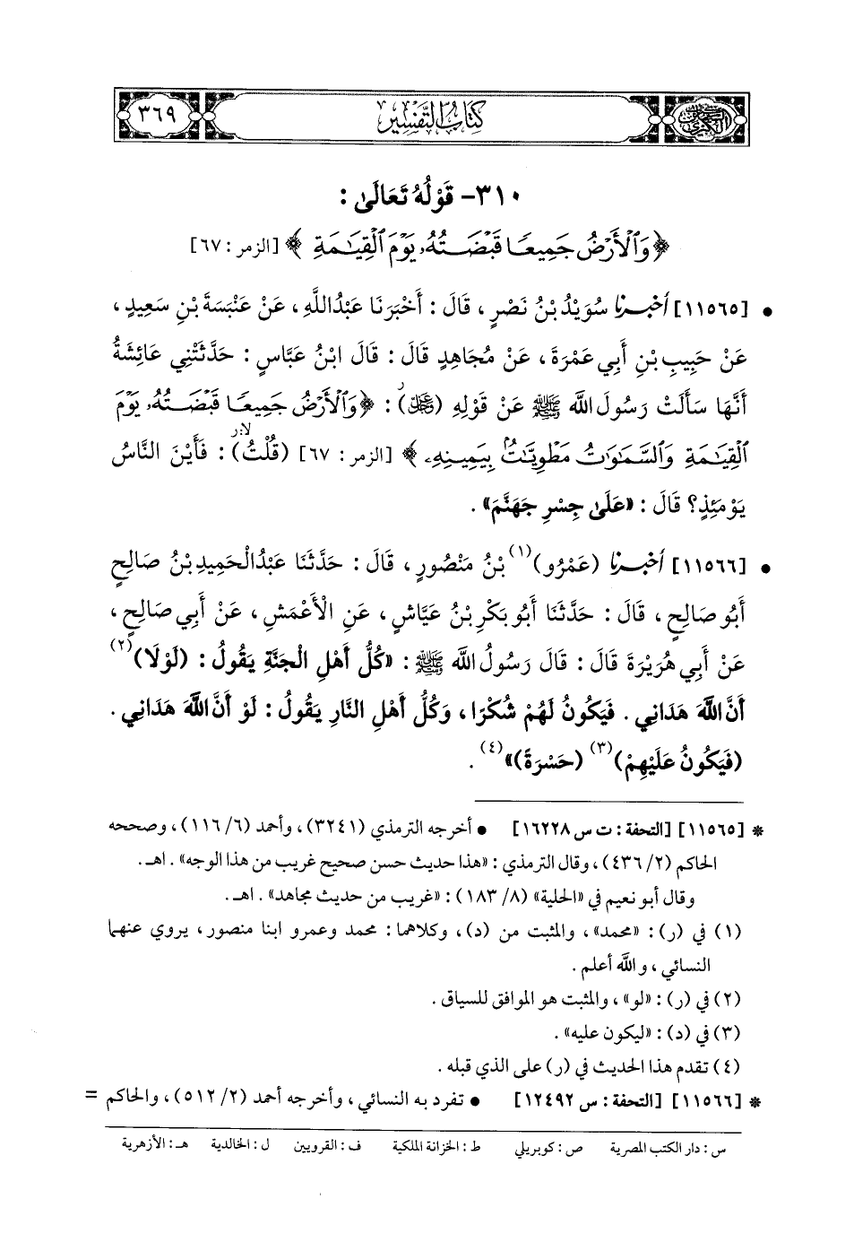310- قَوْلُهُ تَعَالَى: {وَالأَرْضُ جَمِيعًا قَبْضَتُهُ يَوْمَ القِيَامَةِ}.