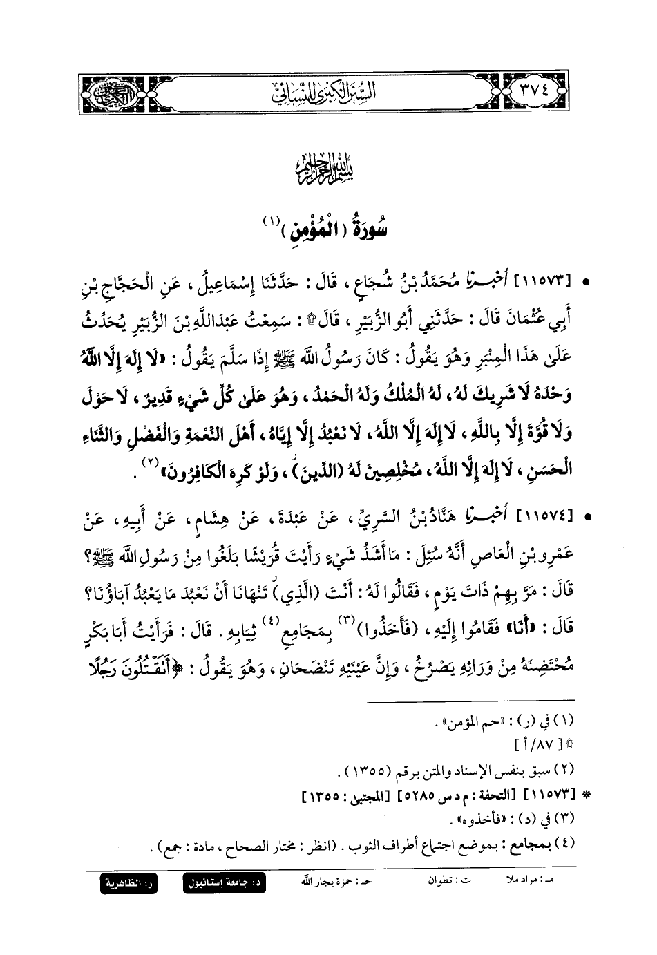 11573- أَخبَرنا مُحَمدُ بنُ شُجَاعٍ، قَالَ: حَدثنا إِسمَاعِيلُ، عَنِ الحَجَّاجِ بنِ أَبي عُثْمَانَ، قَالَ: حَدَّثني أَبو الزُّبَيْرِ، قَالَ: سَمِعْتُ عَبدَ اللهِ بْنَ الزُّبَيْرِ يُحَدِّثُ عَلَى هَذَا المِنْبَرِ وَهُوَ يَقُولُ: كَانَ رَسُولُ اللهِ صَلى الله عَليه وسَلم إِذَا سَلَّمَ يَقُولُ: لا إِلَهَ إِلاَّ اللهُ، وَحْدَهُ لا شَرِيكَ لَهُ، لَهُ المُلْكُ وَلَهُ الحَمْدُ، وَهُوَ عَلَى كُلِّ شَيْءٍ قَدِيرٌ، لا حَوْلَ وَلا قُوَّةَ إِلاَّ بِاللهِ، لا إِلَهَ إِلاَّ اللهُ، لا نَعْبُدُ إِلاَّ إِيَّاهُ، أَهْلُ النِّعْمَةِ وَالفَضْلِ وَالثَّنَاءِ الحَسَنِ، لا إِلَهَ إِلاَّ اللهُ، مُخْلِصِينَ لَهُ الدِّينَ، وَلَوْ كَرِهَ الكَافِرُونَ.