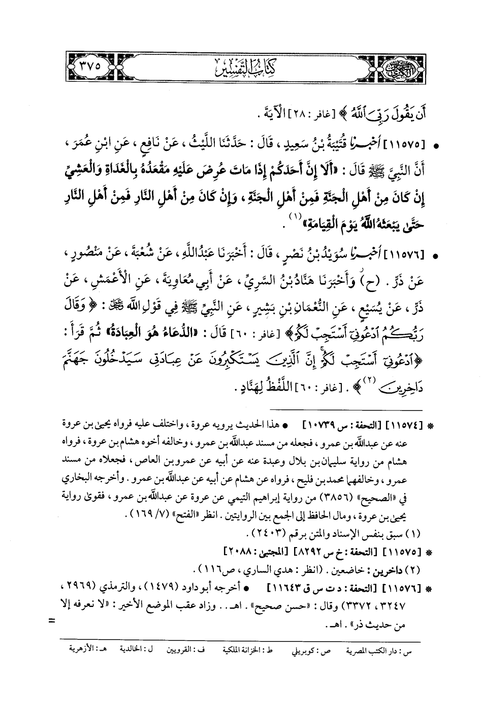 11575- أَخبَرنا قُتَيبَةُ بنُ سَعِيدٍ، قَالَ: حَدثنا اللَّيْثُ، عَن نَافِعٍ، عَنِ ابنِ عُمَرَ، أَنَّ النَّبيَّ صَلى الله عَليه وسَلم قَالَ: أَلا إِنَّ أَحَدَكُمْ إِذَا مَاتَ عُرِضَ عَلَيْهِ مَقْعَدُهُ بِالغَدَاةِ وَالعَشِيِّ، إِنْ كَانَ مِنْ أَهْلِ الجَنَّةِ فَمِنْ أَهْلِ الجَنَّةِ، وَإِنْ كَانَ مِنْ أَهْلِ النَّارِ فَمِنْ أَهْلِ النَّارِ، حَتَّى يَبْعَثَهُ اللهُ يَوْمَ القِيَامَةِ.