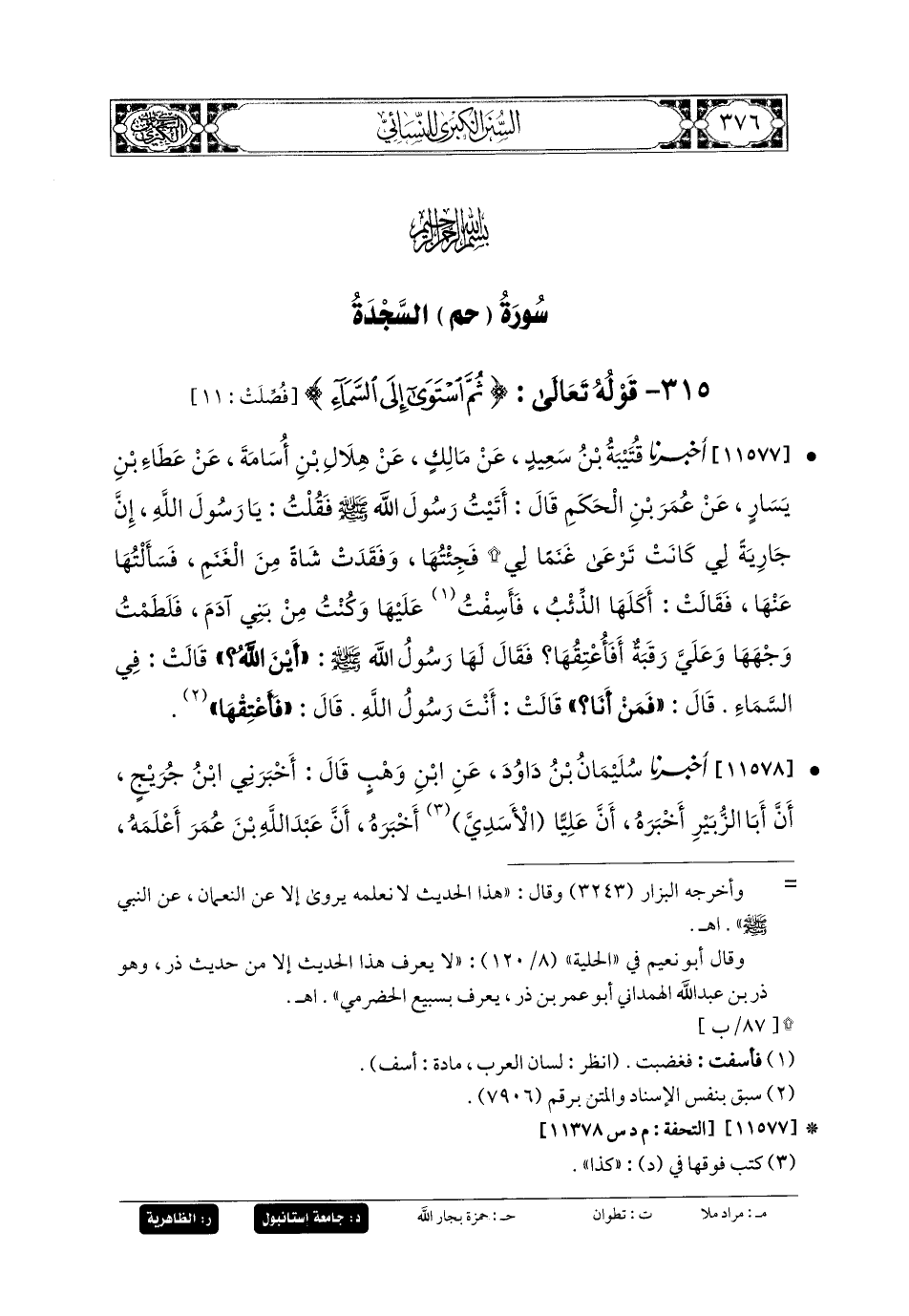 11577- أَخبَرنا قُتَيبَةُ بنُ سَعِيدٍ، عَن مَالِكٍ، عَن هِلالِ بنِ أُسَامَةَ، عَن عَطَاءِ بنِ يَسَارٍ، عَن عُمَرَ بنِ الحَكَمِ، قَالَ: أَتَيْتُ رَسُولَ اللهِ صَلى الله عَليه وسَلم، فَقُلْتُ: يَا رَسُولَ اللهِ، إِنَّ جَارِيَةً لِي كَانَتْ تَرْعَى غَنَمًا لِي، فَجِئْتُهَا وَفَقَدْتُ شَاةً مِنَ الغَنَمِ، فَسَأَلْتُهَا عنها، فَقَالَتْ: أَكَلَهَا الذِّئْبُ، فَأَسِفْتُ عَلَيْهَا، وَكُنْتُ مِنْ بَنِي آدَمَ، فَلَطَمْتُ وَجْهَهَا وَعَلَيَّ رَقَبَةٌ، أَفَأُعْتِقُهَا؟ فَقَالَ لَهَا رَسُولُ اللهِ صَلى الله عَليه وسَلم: أَيْنَ اللهُ؟ قَالَتْ: فِي السَّمَاءِ، قَالَ: فَمَنْ أَنَا؟ قَالَتْ: أَنْتَ رَسُولُ اللهِ، قَالَ: فَأَعْتِقْهَا.